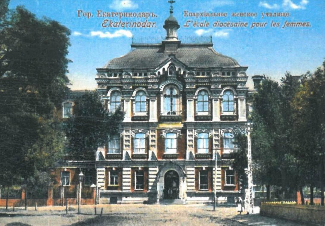 А Вы знали, что здание Кубанского государственного медицинского университета изначально строилось совсем не для медиков? В 1901 году, по проекту архитектора Василия Филиппова (строительство вели архитекторы Мальгерб и инженер Многолет), завершилось возведение женского епархиального училища. Училище было духовным, но выпускались гражданские учительницы! Девушки учились 8 лет, принимались на первый курс после 3 классов церковно-приходской школы, а выпускались с правом преподавания в сельских школах, либо семейной учительницей. Во время обучения жили на полном пансионе. Здание, завершенное в срок – всего за три года, осмотрел областной инженер Н.Ф. Кундухов и не нашел никаких недостатков. Вот как написали о здании в газете «Здание представляет собой грандиозное сооружение в три этажа, выходящее красивым фасадом на Котляровскую улицу (ныне Митрофана Седина). По величине своей и архитектурной красоте оно занимает первое место в городе, уступая только, быть может, помещению, занимаемому Окру