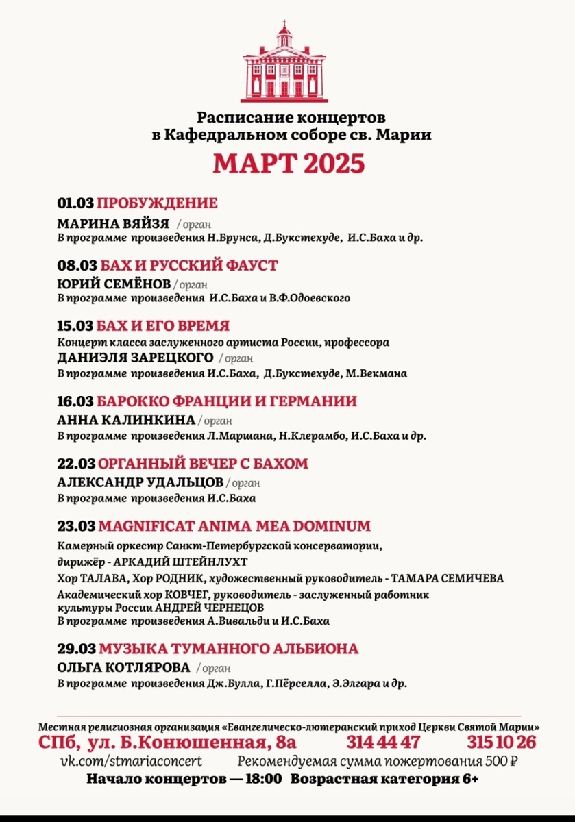 Концерты в церкви проводятся регулярно по субботам и воскресеньям, программу можно посмотреть в группе ВКонтакте. Вот программа на март, как видите, здесь не только орган, но и инструментальные и хоровые выступления.