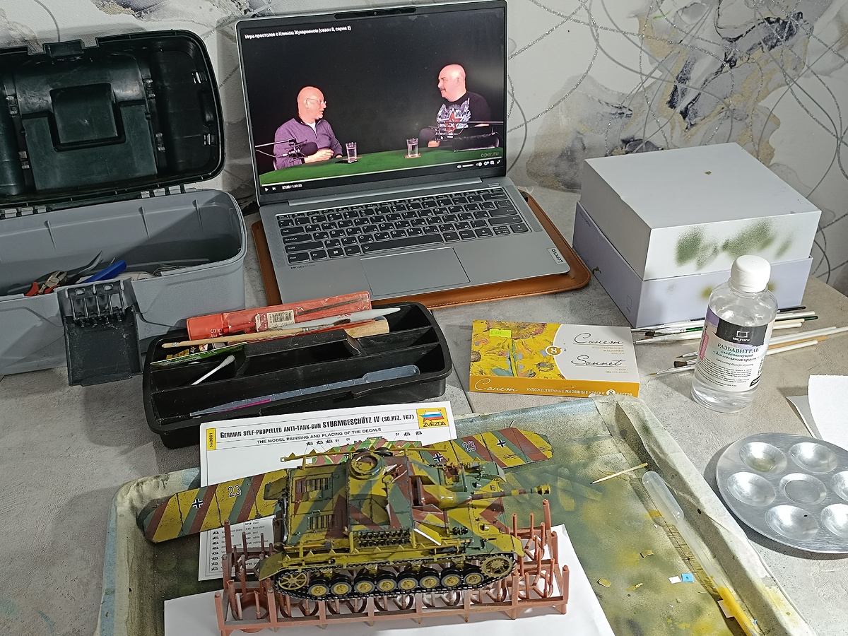 Сегодня отчет за несколько дней и этапов, которые были в эти дни реализованы Эта статья - продолжение цикла о сборке модели StuG IV в 35 масштабе от "Звезды". Начало в подборке: Доброго времени! Рад Вам на моем канале! Для Вас пишет Дмитрий Лыков, автор канала Сервисный консультант - начинающий моделист и фанат автомобилей Чтобы не пропустить новое - подпишитесь на канал Так как моя задумка внешнего вида модели предусматривает, что самоходка эксплуатируемая, то ЛКП не может быть идеальным. Значит - вооружаюсь губкой, тонкой кистью и рисую сколы там, где они могут возникать После того, как все, что хотелось, акрилом нарисовано, в плане покраски будет работа масляными красками и пигментами. Следовательно, нужен лаковый слой, причем глянцевый. На высохший лак наношу декали с балке