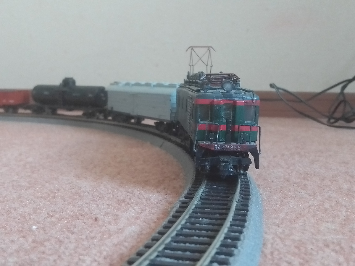 Приветствую всех на моем канале! Недавно моя коллекция пополнилась еще одним электровозом - ВЛ22м-956. Однако с первого взгляда видно, что модель выглядит весьма "уставшей": Сначала я посчитал это недостатком, но потом посмотрел фотографии ВЛ22м в АО "Апатит": Несмотря на грязь и ржавчину, электровоз "Горячий" (То есть рабочий), поднят токоприемник, он везет состав из думпкаров. Но давайте отвлечемся отвлечемся от реального ВЛ22м и посмотрим на модель Модель электровоза была отлита из смолы и сделана ходовой Евгением Егоровым. Затем до меня ВЛка побывала еще в чьей-то коллекции, где и получила характерный "обгадинг" Модель ходовая, реализован свет в прожекторе и буферных фонарях По ходовым качествам модель хорошая — на каждой телеге установлен шестиполюсной электродвигатель. Имеется видео, где электровоз тянет вагон, в котором лежит килограмм (!) свинца Из минусов ходовки — шумные редукторы, которые стоят в тележках, купленных в Китае Модель окрашена в зеленый цвет — стандартный дл