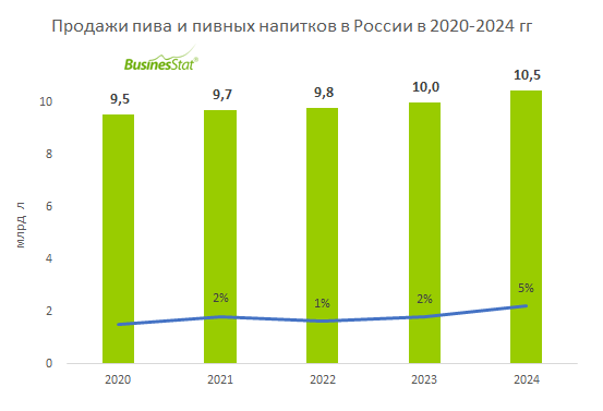 По данным «Анализа рынка пива и пивных напитков в России», подготовленного BusinesStat в 2025 г, их продажи в стране в 2020-2024 гг выросли на 10%: с 9,5 до 10,5 млрд л. Наибольший прирост реализации пивной продукции наблюдался в 2023-2024 гг и был связан со следующими факторами: Полный обзор рынка на РБК: https://marketing.rbc.ru/research/26358/ Полный обзор рынка на нашем сайте: https://businesstat.ru/catalog/id9194/