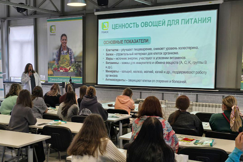 В Агрофирме «ПОИСК» продолжается активная работа с образовательными учреждениями страны в рамках профориентационной деятельности. Важно не только познакомить студентов с передовыми технологиями в сфере селекции и семеноводства, но и помочь им определиться с будущей профессией, продемонстрировав возможности для карьерного роста. Недавно компанию посетили студенты 1-4 курсов ФГБОУ ВО «Ярославский государственный аграрный университет». Для ребят были организованы экскурсия по предприятию и знакомство с ведущими специалистами компании, которые поделились своим опытом работы и ответили на все интересующие вопросы. Особенно ценным для участников стало общение с настоящими профессионалами своего дела – селекционерами, кандидатами сельскохозяйственных наук. В рамках лекции на тему «Инструменты селекции для здоровья и долголетия» были раскрыты современные подходы к выведению новых сортов и гибридов, а также продемонстрированы успехи компании в данной области. Помимо теоретической части, ребята