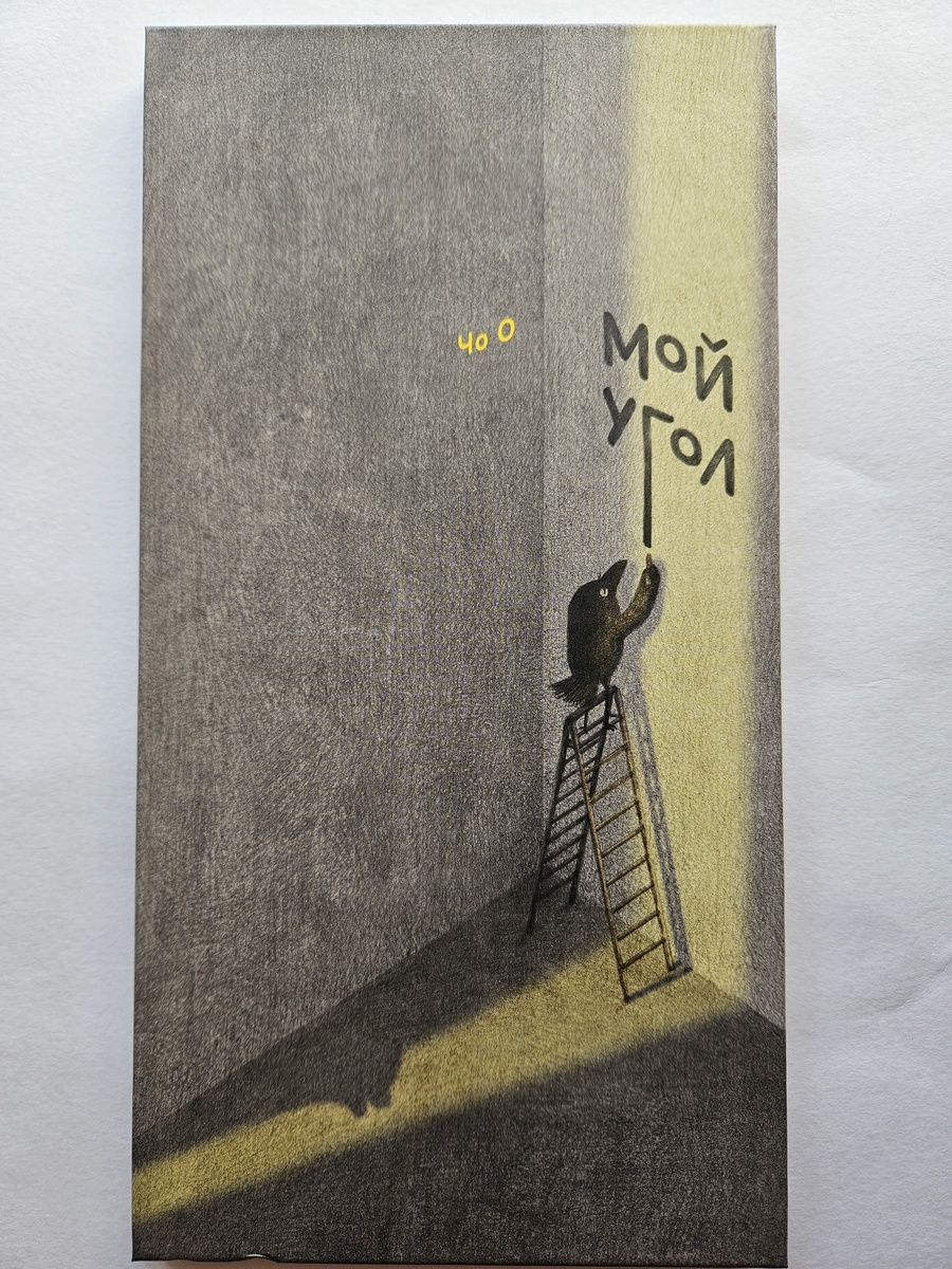 Книжка-картинка корейской художницы. Место действия книги — угол. У вороны появляется собственный угол и она неспешно начинает обживать его. Сначала просто сидит, затем лежит, задрав ножки. Но угол углом, а комфорт тоже нужен. Если читатель еще не знаком с книгой, то можно пофантазировать, что может появиться в углу у вороны. Первой в углу появляется — кровать. А за ней, бальзам на сердце любого читателя, стеллажик с книгами и лампа. Наша ворона любит читать. Комфортно и уютно, но не хватает чего-то живого. В комнате появляется горшочек с растением. Какое-то время ворону все устраивает, но наступает момент, когда чувство, что чего-то не хватает, появляется вновь. Ворона начинает разрисовывать скучные белые стены ярким солнечным орнаментом. Задача непростая, стены большие, работы много. На иллюстрациях появляются дополнительные лесенки, новые детали, которые очень интересно находить и рассматривать. Движение времени на иллюстрациях ощущается не только по заполнению стен орнаментом, м