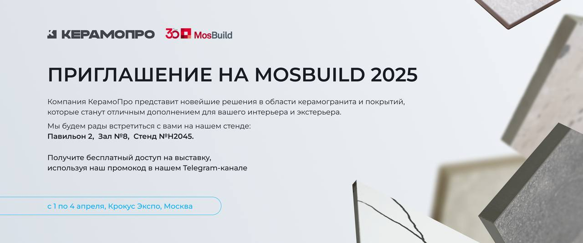 Получите бесплатный билет с промокодом MBCONNECT🔥 MosBuild 2025 — крупнейшая международная выставка строительных и интерьерных решений в России. Более 1 300 экспонентов из России и других стран представят продукцию, охватывающую все этапы строительства и оформления домов и помещений. Выставка пройдет с 1 по 4 апреля 2025 года в МВЦ «Крокус Экспо». В прошлом году более 60 тыс. специалистов посетили мероприятие. Чтобы получить бесплатный билет на MosBuild 2025, просто зарегистрируйтесь на официальном сайте выставки и воспользуйтесь промокодом из нашего тг-канала https://t.me/keramopro. Для этого перейдите по ссылке (https://mosbuild.com/ru/visit/get-e-ticket/) , выберите пункт «У меня есть промокод для бесплатного посещения», заполните анкету, а на последнем этапе регистрации введите промокод из канала https://t.me/keramopro и нажмите «Применить» (не «Оплатить»!). После этого ваш билет появится на экране и будет отправлен на указанный вами e-mail. Билет действителен все 4 дня выставки,