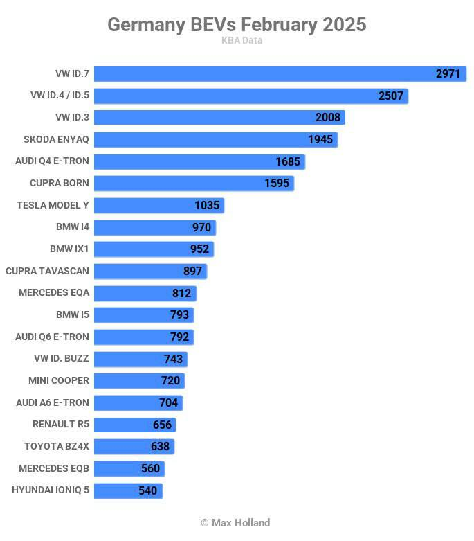 На первом месте Volkswagen ID.7 (причём уже второй месяц подряд) — 2971 единиц. ID.4/ID.5 на втором месте — 2507 единиц, на третьем ID.3 — 2008 единиц.