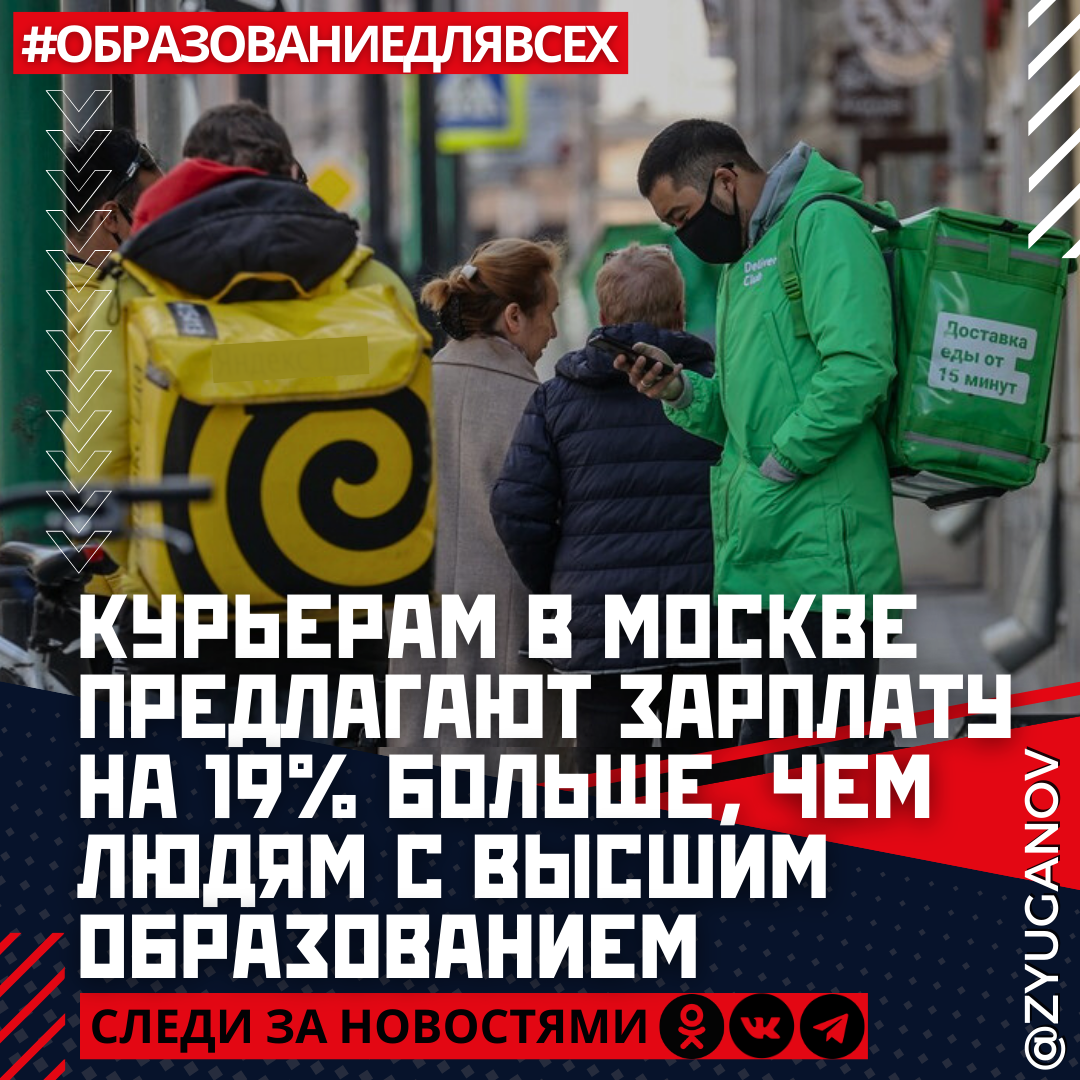 Активно обсуждается новость о том, что курьерам в Москве предлагают зарплату на 19% больше, чем людям с высшим образованием: 130 против 105 тыс. руб. соответственно. При этом зарплатные предложения для курьеров за год выросли на 41%.