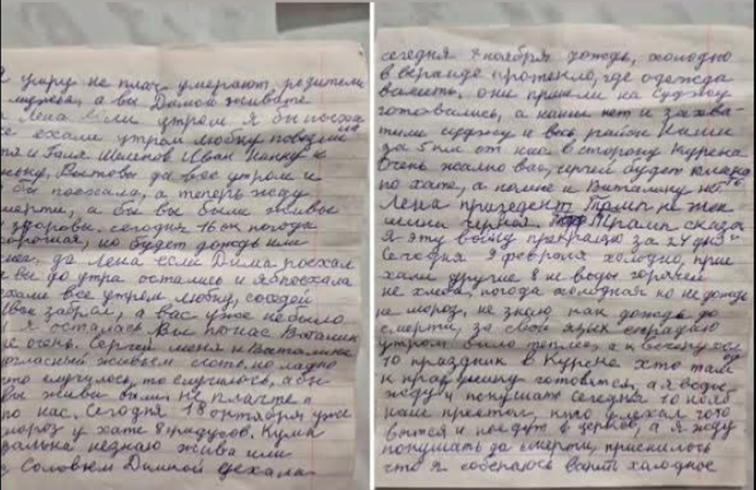 Вы уже, конечно, слышали о страшной находке на освобожденной Курщине. Село Мартыновка находилось под оккупацией, и Татьяна Сергеевна Васькова 25.07.1947 года рождения ум*рла от голода и холода у себя дома. На столе у нее лежали градусник и старые фотографии. На снимках — её родственники и, вероятно, та самая Лена, которой старушка каждый день писала трогательные письма до востребования. Оставшись совсем одна в остывающем доме под украинской оккупацией, она находила в этих фотографиях последнюю связь с близкими, представляя, что общается с ними, что они рядом... «Сегодня 20 октября, температура 6 градусов в хате. Я жива». «Сегодня 26 октября, ещё тепло, 7 градусов на улице, но на улицу выйти нельзя, летают с камерой, пускают бомбы… Спать ложусь в 5-6 часов. Живу в настоящем аду». «Напишу, как я жила, спала в сарае под столом… Каждый день прошу смерти. С сарая перешла в хату, буду лежать на кровати, часов нет. Потом лежала под кроватью». «Есть уже не было ничего 12 дней». «Я всё вам прощ