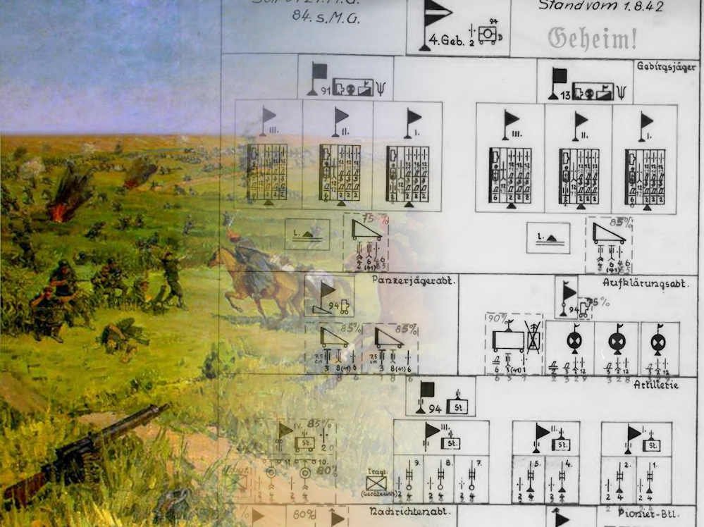 Теперь давайте посмотрим на Вермахт. Про пехотные дивизии большинство имеют какое-то представление, потому давайте поговорим про дивизии горные. На примере 4-й горной. Кстати, правильно их называть именно горные (Gebirgs-Division), а не горнопехотные, и, тем более, горноегерские. А вот полки в них именовались горноегерскими — Gebirgsjäger-Regiment. В горной дивизии было два полка по три батальона, а также горноартиллерийский полк (Gebirgs-Artillerie-Regiment), горный противотанковый дивизион (Gebirgs-Panzerjäger-Abteilung), горный сапёрный батальон (Gebirgs-Pionier-Bataillon), разведывательный дивизион (Aufklärungsabteilung) и батальон связи (Nachrichten-Abteilung). Поскольку у нас есть много данных по 4-й горной дивизии, то давайте сразу и рассмотрим состав горных дивизий на её примере. Начнём с полков. В полку три батальона, в батальоне по три стрелковых роты и рота огневой поддержки. В стрелковых ротах по 11-12 ручных пулемётов (всего в ротах 102), по 3 50-мм и 2 81-мм миномёта. В