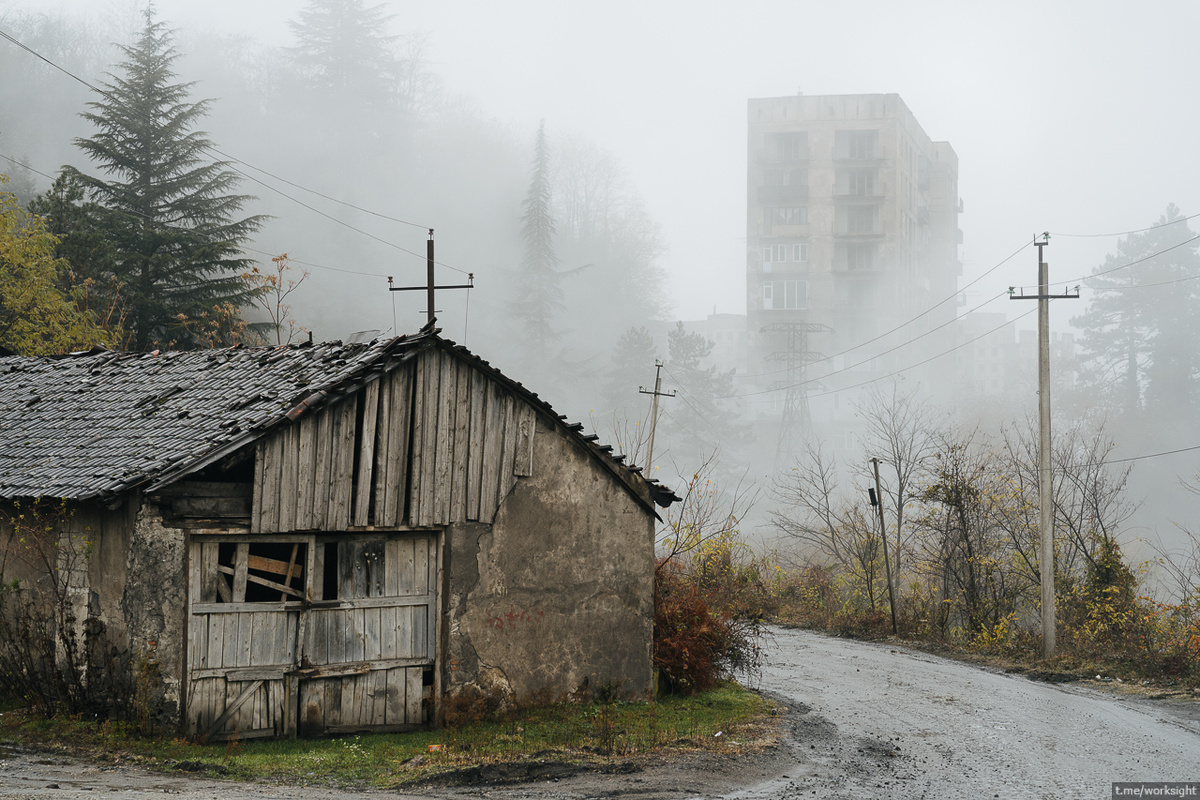 Жуткие и депрессивные впечатления ждали нашу небольшую съемочную группу по пути к точке назначения. Осеннее-зимнее межсезонье и дождливая погода усиливали и без того безнадежные виды. Мы ехали на смотровую площадку, указанную на карте, но когда перед нами из тумана выплыл призрак многоэтажного дома, мы невольно остановились. Дом был серым от времени и весь в ржавых подтеках. Где-то вместо окон на нас смотрели черные проемы пустых квартир. Я представил, что когда-то здесь бурлила жизнь, шахтеры возвращались со смены домой, дети с криками носились по футбольной площадке, а бабульки наводили красоту в небольших огородах под окнами. А сейчас все было мертво, и даже дождь шел беззвучно. Но вдруг тишину нарушили совершенно неуместные звуки рывков — я был уверен, что прямо за самосвалом пытались завести то ли мопед, то ли бензиновую газонокосилку. Но к моему удивлению оказалось, что так гудит большая недовольная свинья, которая вышла посмотреть на внезапных гостей. Из кустов прибежала курица,