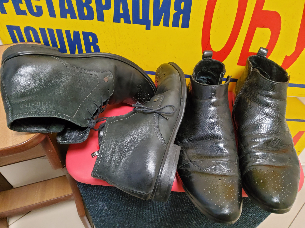 "Я ему говорю, выброси, выброси, а он...." Да он свои Честры будет носить до тех пор, пока одни шнурки не останутся целыми. Ну не Карри же он будет покупать! В его честерах хоть товар(кожверх) хорошего качества, да и сборка приличная. Такую обувь можно и востановить до приемлемого уровня. Что и было сделано. Такой обуви( из серванта), купленной в былые, жирные годы, приносят все меньше и меньше. Заканчивается она, однако! Вот еще две пары из той же серии. Привёз шофёр хозяйские пары на реставрацию. Всё собрано очень хорошо и из отличных материалов. А они многое "позволяют". Было так. Задир, потертости, мелкие сколы на рантах, каблуках.... Пришлось повозится... Благо цвёт черный, да фирменная косметика еще есть. Здесь, ставшая уже для меня, банальная реставрация подпяточников и реставрация верха.. А эти выпускные туфли прямиком из магазина, носить их выпускница не может, так как ремни очень давят. Где то производитель накосячил в разработке модели. Будем разбираться... Клиент знат