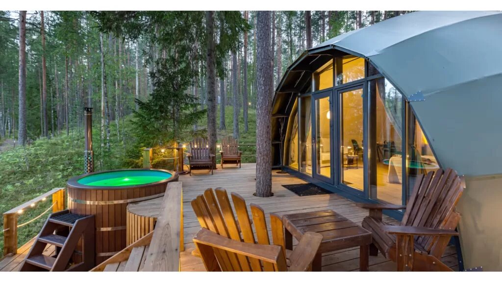- Малогабаритные домики: самый популярный вариант, с отдельными санузлами и кухнями. Включает A-образные дома, переоборудованные морские контейнеры, купольные дома и автономные модули.