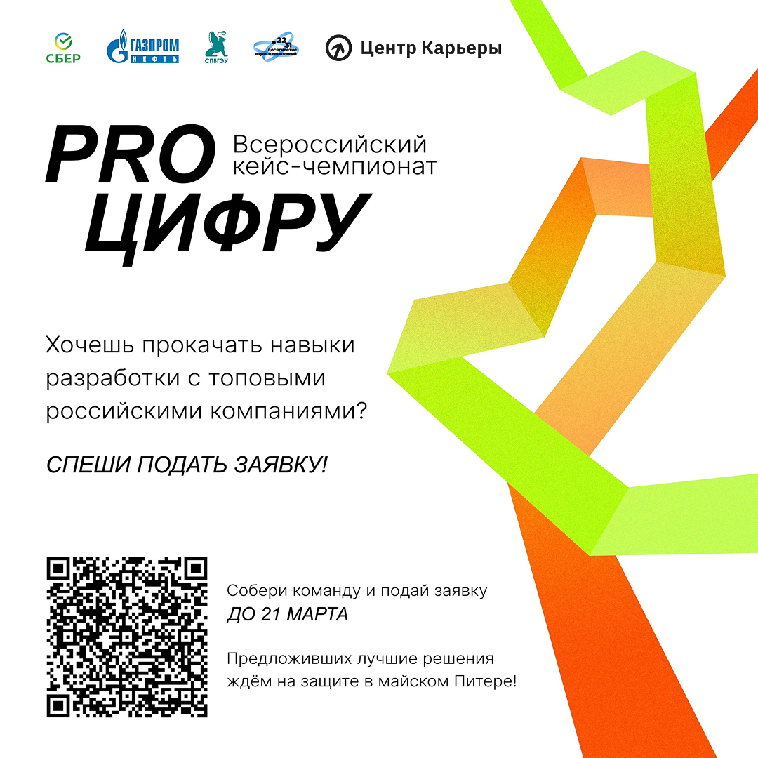 Готов к вызову? Сбер, Газпром нефть и Санкт-Петербургский государственный экономический университет приглашают тебя принять участие в чемпионате мечты, который стартует 24 марта, и решить IT-кейсы от ведущих компаний страны. Участников ждут ценные призы, дипломы о победе или участии в Кейс-чемпионате и самое главное – незабываемый опыт работы в команде совместно с экспертами Газпром нефти и Сбера. 🌟 Не упусти возможность: ● реализовать твои идеи = реальные бизнес-решения для крупнейших компаний; ● получить опыт интенсивной разработки IT-решений: создавай прототипы приложений, тестируй идеи и работай в команде над реальными кейсами; ● достигнуть успеха и побороться за ценные призы. 🎯 Треки чемпионата: От Сбера: 1. Создание интерактивной академической платформы для участия в программах внутрироссийского семестрового обмена. 2. Разработка сервиса для деления счета в ресторанах. От Газпром нефти: 3. Разработка цифрового решения для привлечения молодых специалистов. 4. Создание системы а