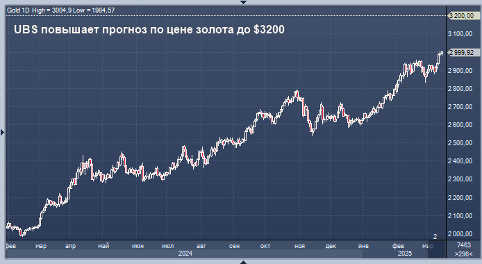 Ожидается, что в течение следующих четырех кварталов цена на золото составит 3200 долларов за унцию. Банк сослался на протекционизм График цены наличного золота интервалами в 1 день В понедельник UBS Group AG стал последним банком, который повысил прогноз стоимости золота. Это связано с растущей вероятностью затяжной мировой торговой войны. Аналитики ожидают, что этот сценарий будет побуждать инвесторов покупать больше этого надёжного актива. В течение следующих четырёх кварталов ожидается, что стоимость золота составит 3200 долларов за унцию. Это повышение по сравнению с предыдущим долгосрочным прогнозом банка в 3000 долларов. Уэйн Гордон и Джованни Стауново, аналитики, подчеркнули роль драгоценного металла как средства сбережения в нестабильные времена. Банк указал на план президента США Дональда Трампа ввести взаимные тарифы и дополнительные отраслевые тарифы 2 апреля. Это может подстегнуть текущий спрос на убежище на всех рынках. Золото, которое впервые в истории в пятницу преодоле