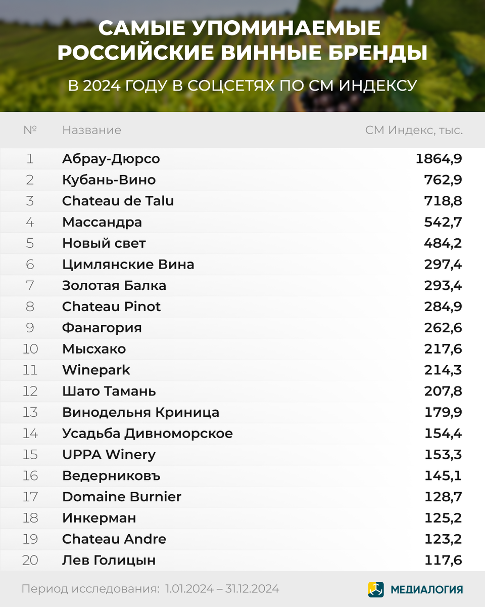 Используя систему «Медиалогия SM», проанализировали самые упоминаемые российские винные бренды в 2024 году в соцсетях. «Абрау-Дюрсо» уверенно занимает первое место в рейтинге с показателем СМ Индекса 1,8 млн. Владелец компании Борис Титов предложил разрешить круглосуточную продажу российского вина, что вызвало широкий резонанс в социальных сетях. Также бренд оказался в центре внимания из-за роста цен на вино на 35% в связи с повышением акцизов. На втором месте «Кубань-Вино» со значением СМ Индекса 762,9 тыс. В 2024 году бренд привлек особое внимание благодаря проверке Роскачества, которое признало его игристое вино одним из лучших в стране. Тройку лидеров замыкает Chateau de Talu с показателем СМ Индекса - 718,8 тыс. Компания представила коллекцию вин под названием «Ур