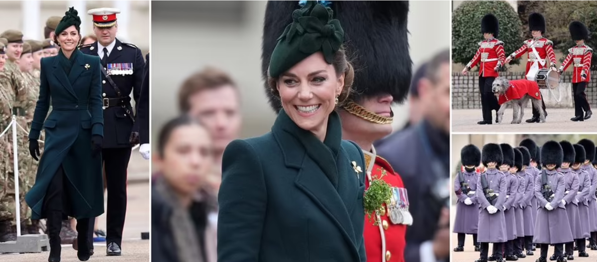 Принцесса Уэльская прибыла 17 марта в казармы Веллингтона, где полностью исполнила свою роль почетного полковника Ирландской гвардии. В прошлом году она не смогла присутствовать на параде из-за болезни, поэтому в нынешнем году ее ждали с особым нетерпением. Кэтрин "унаследовала" покровительство над Ирландской гвардией от мужа, принца Уильяма, ротация прошла после ухода в мир иной королевы Елизаветы II. Принц Уильям стал полковником Уэльской гвардии, Кэтрин - Ирландской. На параде Кэтрин встречали не только гвардейцы, но и талисман Ирландской гвардии, ирландский волкодав Терлоу Мор. Для участия в параде Кэтрин, принцесса Уэльская, надела зеленое платье-пальто от Alexander McQueen, дополнив образ шляпкой Lock&Co соответствующего цвета и черными сапогами на каблуке Gianvito Rossi, а в качестве украшения выбрала брошь в форме трилистника. Трилистник - символ Дня святого Патрика и Ирландии в целом. По словам королевского редактора GB News Кэмерона Уокера, Кэтрин также в честь Дня святог