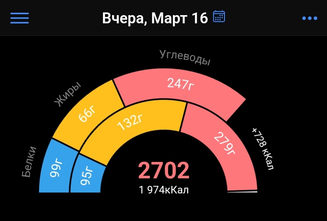 В Москве в полную власть вступает весна: солнце сияет, на деревьях набухли почки и вот-вот распустятся листья! В это великолепное воскресенье, 16 марта, мы с подругами условились пообедать в центре. Для меня это вдвойне праздник, ведь я впервые выбралась куда-то, не считая детской поликлиники и единственной поездки в офис полгода назад. Я по-прежнему стойко держу свой КБЖУ-чэллендж: честно считаю и записываю калории и нутрициенты, стараюсь минимум 20 минут в день уделить кардио-тренировке. Так что к обеду в ресторане пришлось подготовиться. Я заранее изучила меню, выбрала блюда и рассчитала калорийность по таблице с сайта заведения. Оказалось, мой скромный обед из салата с ростбифом и брускетты с козьим сыром - это 300 граммов и почти 800 калорий! Всего же я вчера "разгулялась" на 2702 ккал, при норме 1974, по подсчётам приложения. Превышение я оправдываю тем, что кормящая мать, мне надо хорошо питаться. Однако с тем, чтобы накормить Лизусю, вчера возникли проблемы. Гулять я уходил