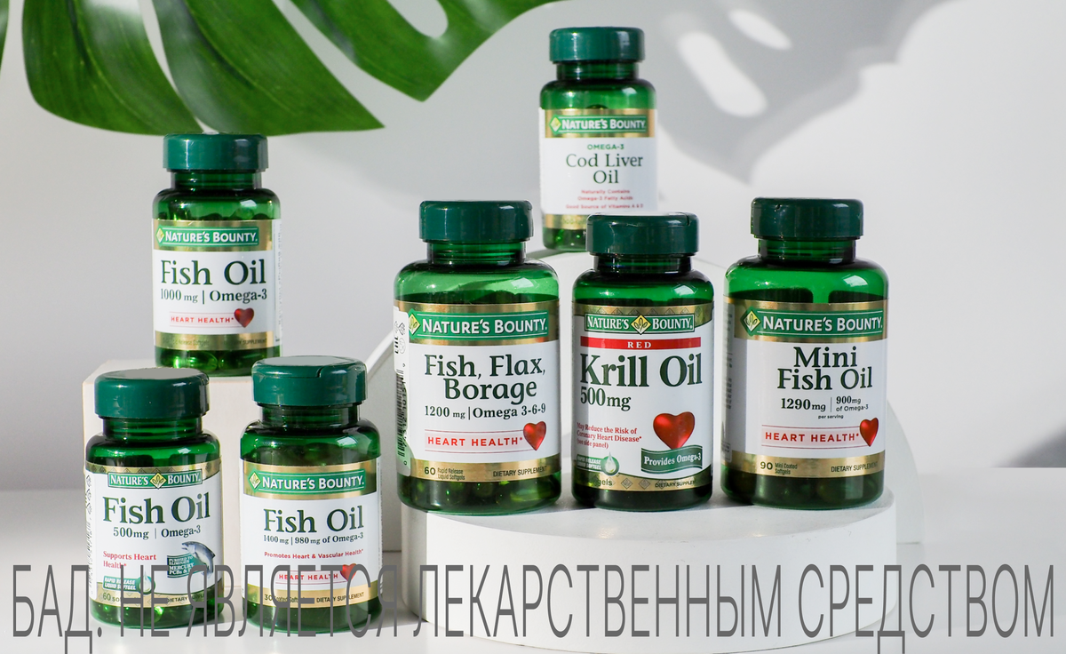 Например, Рыбий жир 1400 мг / 980 мг Омега-3 от Nature’s Bounty (Нэйчес Баунти) включает 980 мг омега-3 в одной капсуле — как раз столько рекомендуют ученые для поддержки организма, восстановления клеток, замедления процессов старения.