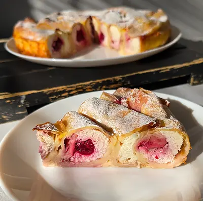 На десять блинов: Молоко - 200 мл Кипяток - 200 мл Яйца – три штуки Caxap – две столовых ложки Соль – треть чайной ложки Подсолнечное масло – три столовых ложки Мука пшеничная - 130 г. Начинка: Творог - 500 г Яйцо – одна штука Сахар – две столовых ложки Ванильный сахар - один пакетик Вишня размороженная - 200 г Сливочное масло растопленное- 30 г. Заливка: Яйца – два штуки Молоко - 200 мл Сахарный песок - 100 г. Все нужные продукты мы собрали. Начинаем готовить вкусную блинную улитку с начинкой.