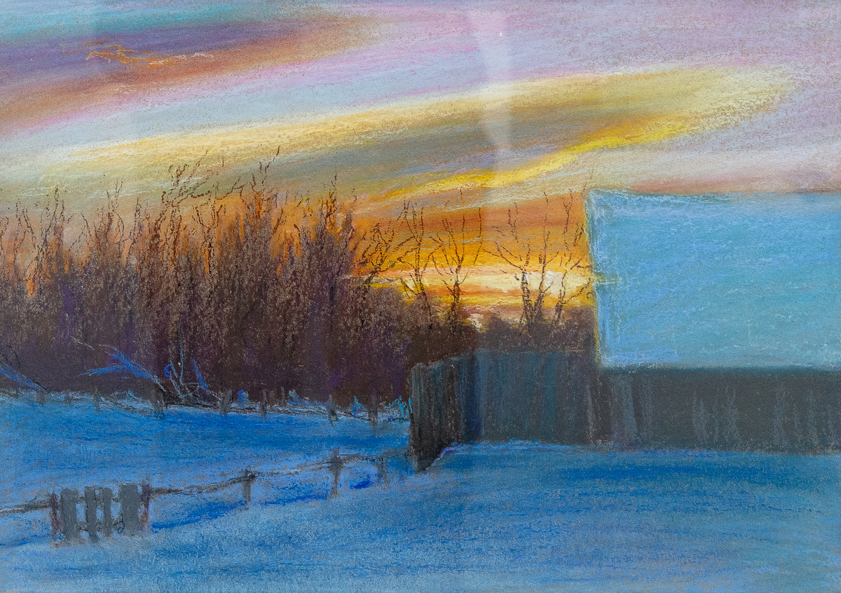 Другая картина - «Зимний вечер». На холсте - золотистое небо, закат, который тихо льётся на крышу одинокого сарая.