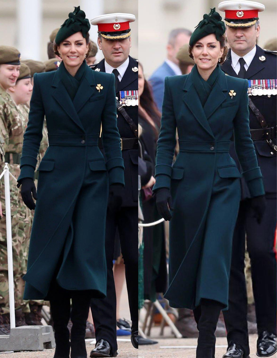 У Кейт сегодня сольное мероприятие, она прибыла на парад Ирландской гвардии в честь Дня святого Патрика. По традиции Кэтрин надела пальто тёмно-зелёного оттенка от Alexander McQueen, Кейт дополнила свой образ чёрными ботильонами на каблуке и беретом, а также булавкой с трилистником. Шляпа та, которую она надевала в 2019 году на этот же парад. Волосы аккуратно уложены под шляпкой: Кэтрин традиционно вручила веточки трилистника гвардейцам. Знакомство с талисманом полка, Турлоу, ирландским волкодавом. После парада она пообщалась с военнослужащими и вручила им награды: В беседе с группой военнослужащих она расспросила их о трудностях, с которыми они сталкиваются во время службы. Она сказала: «Уметь находить баланс между работой и личной жизнью — это непросто». Барри Лафлин из гвардии, который произнёс тост, позже сказал: «Она хотела узнать, как обстоят дела у парней в целом. Немного видео в телеграмм-канале: