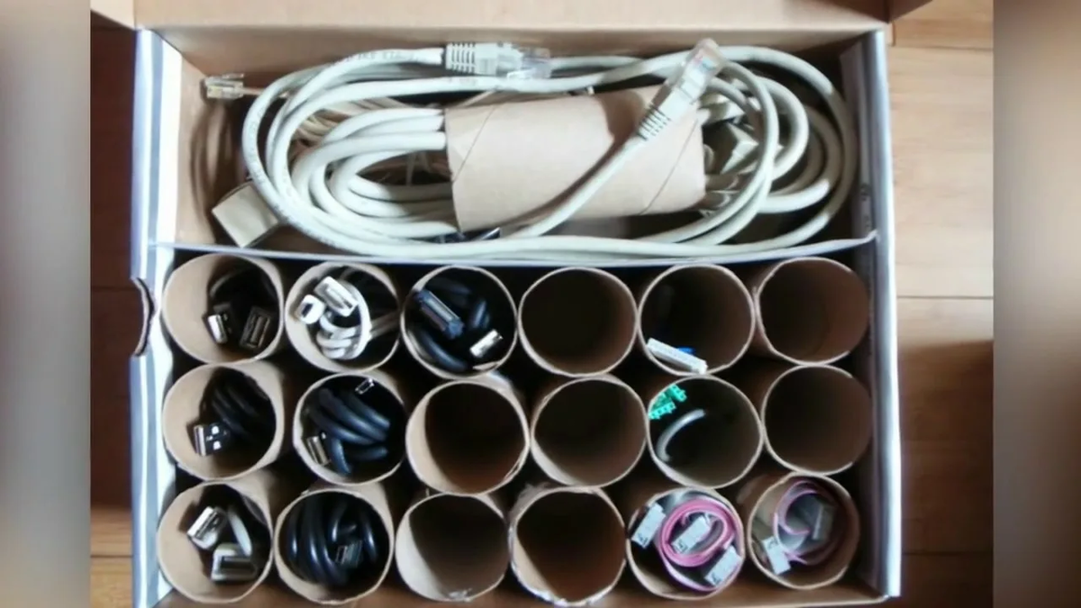Из обычных втулок можно сделать отличные хранилища для лишних проводов. Если провод пока не нужен, а выкидывать его жалко, можно сложить провод несколько раз и запихнуть его во втулку.