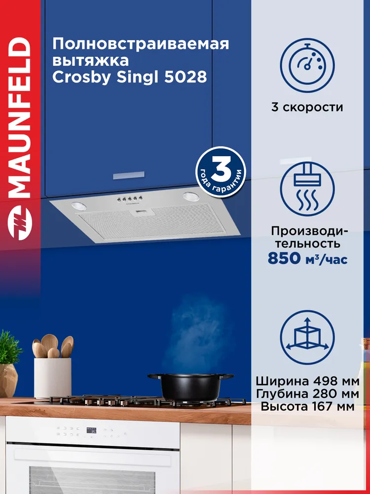 Вытяжка MAUNFELD Crosby Singl 5028 ориентирована на широкий круг пользователей. Она подойдет как для семей с детьми, так и для профессиональных поваров, которые ценят качество и эффективность. Вытяжка будет идеальна для тех, кто ищет надежное и стильное решение для своей кухни.