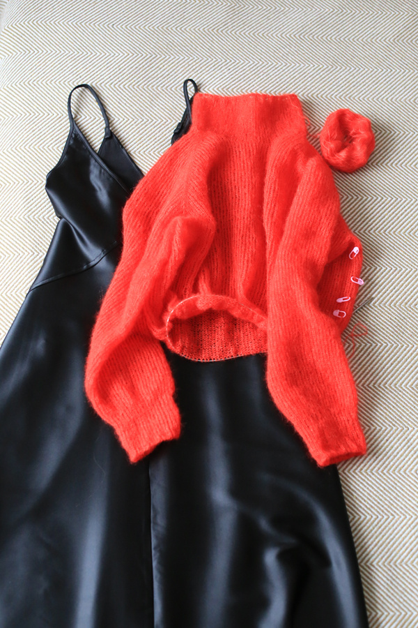 Подбираюсь к талии! Где талию делать будем?))) На фото у меня почти 60 рядов от проймы, осталось еще рядов 20, но точную длину лучше определить с тем, чем буду носить. Вчера купила платье-комбинацию - для иных целей, но к кид-мохеровым паутинкам оно тоже подходит (особенно по гладкости ткани). Оказалось, что платьев в бельевом стиле сейчас много в магазинах (масс-маркет), есть из чего выбрать: и с французскими вытачками, и по косой, и с разными вырезами и юбками (клешением юбки). Моё, например, очень плотное и с карманами))). Полноценной примерки со свитером еще не было: у платья надо поднять бретельки под мой рост; пока держу их пальцами - съезжает всё остальное. Рано утром было время перешить, но не позволили швейные суеверия: нельзя начинать новый день с роспуска (а не то вся работа за день под роспуск уйдёт). И вот уже вечер, а воз и ныне там. Классика. На фото второй свитерок-паутинка, который вяжу по одному и тому же "лекалу", что и все остальные. Приспособилась хранить недовяз