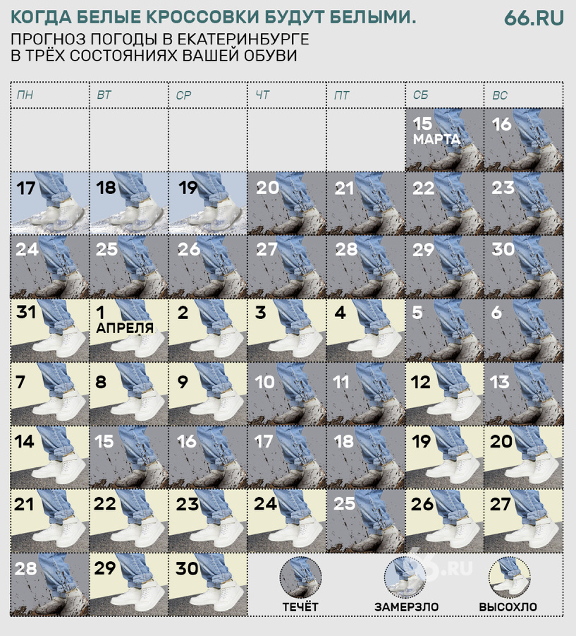 18 марта на севере региона ожидается небольшой мокрый снег. На юге будет облачно с прояснениями, ночью небольшие осадки, а днем — мокрый снег или дождь. Температура ночью на юге области составит от +1 до -4 °C, в горах до -7 °C, на севере от -5 до -10 °C. Днем температура будет колебаться от 0 до +5 °C, на севере до -3 °C. Местами сильный ветер — до 13 м/с. В Екатеринбурге 18 марта ожидается небольшой мокрый снег или дождь. Ночью и утром на дорогах возможна гололедица. Температура ночью будет около 0 °C, днем от +3 до +5 °C. 19 марта на севере осадков почти не ожидается, а на юге ночью пройдет небольшой снег, на крайнем юге возможен снегопад. В отдельных районах вероятно налипание мокрого снега на провода и гололедица на дорогах. Температура ночью в области составит от -1 до -6 °C, на севере до -11 °C, на Крайнем Севере до -21 °C. Днем температура будет от -1 до +4 °C. В Екатеринбурге 19 марта будет облачно, ночью пройдет сильный снег, днем — мокрый снег. Температура ночью составит от