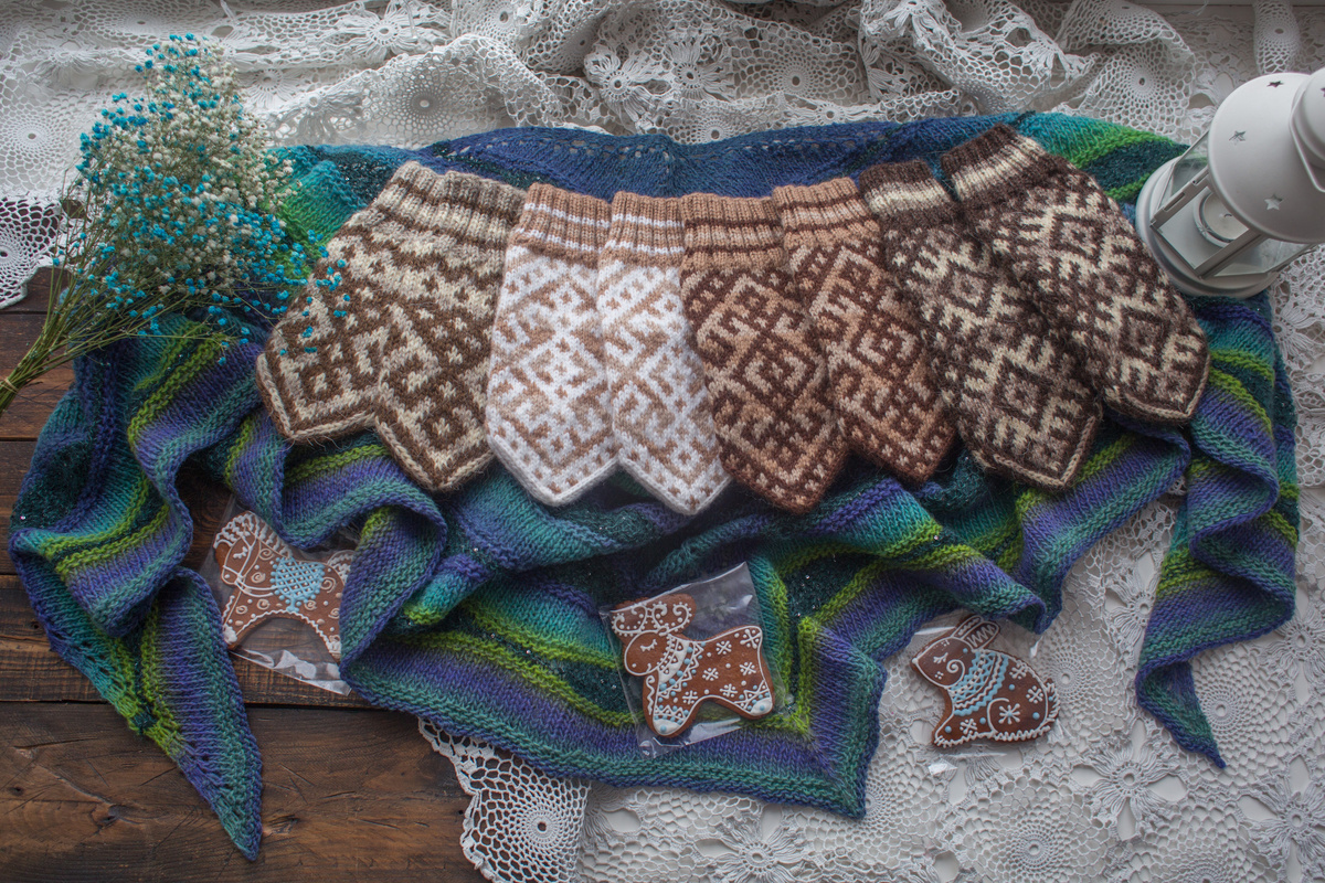 Весна уже вступает в свои права, а я ещё не всё за зиму связанное показала. Прошедший февраль у меня выдался богатым на рукавички, и особая радость для меня, как мастера - когда столько красоты разом уезжает в одну семью. Расскажу поподробнее про каждую пару. Фото для удобства объединила в галереи, их можно листать. В каждой галерее подбор пряжи с этикетками и спиц. Схемы оставлю в комментариях к статье. Варежки 1. Пряжа Подмосковная Троицкая, 100 грамм/250 метров. Спицы №2 для резинки и №2,5 для узора. Ширина 10 см, длина до резинки 18 см, общая длина 23 см. Вес 68 грамм. Узор - Макошь на 64 петли. Варежки 2. Пряжа Подмосковная Троицкая, 100 грамм/250 метров и Верблюжка от Камтекс, 100 грамм/250 метров. Спицы №2 для резинки и №2,5 для узора. Ширина 10 см, длина до резинки 18 см, общая длина 24 см. Вес 67 грамм. Узор - Макошь на 64 петли. Эти две пары связаны по одной схеме, но насколько по-разному смотрится узор в тёмном и светлом варианте. Варежки 3. Небольшие, на детскую (подростков