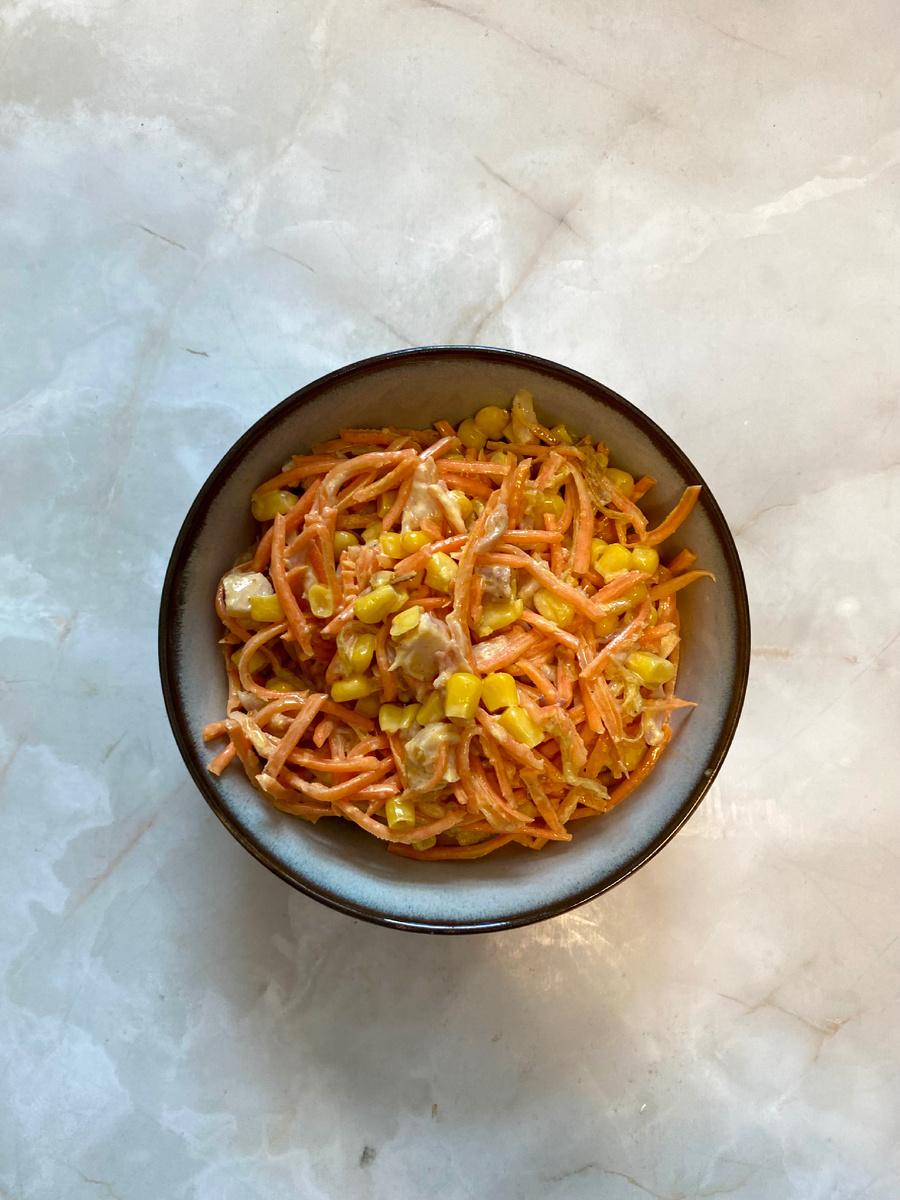 Салат с копченой грудкой, корейской морковью и кукурузой