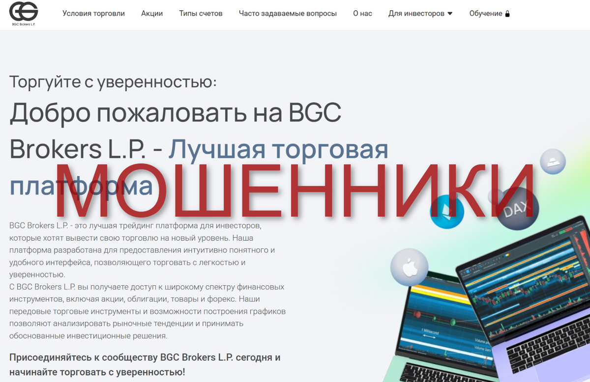 BGC Brokers L.P. позиционирует себя как профессионального брокера, предоставляющего доступ к мировым финансовым рынкам. Согласно информации на сайте, компания предлагает широкий выбор активов, удобную платформу и квалифицированную поддержку. Однако при детальном анализе обнаруживаются явные признаки мошенничества. На первый взгляд, сайт BGC Brokers L.P. выглядит презентабельно, но это лишь часть продуманной схемы. Большинство мошеннических платформ используют типовые шаблоны, чтобы создать иллюзию надежности. 🔴 Что вызывает подозрения? Такой подход характерен для мошеннических брокеров, создающих платформы без реального выхода на рынок. Пользователи, столкнувшиеся с этим проектом, в большинстве случаев жалуются на невозможность вывода средств. Среди наиболее частых проблем: ❌ Демонстрация "фейковой прибыли" – сначала баланс растет, но при попытке вывода начинаются сложности.