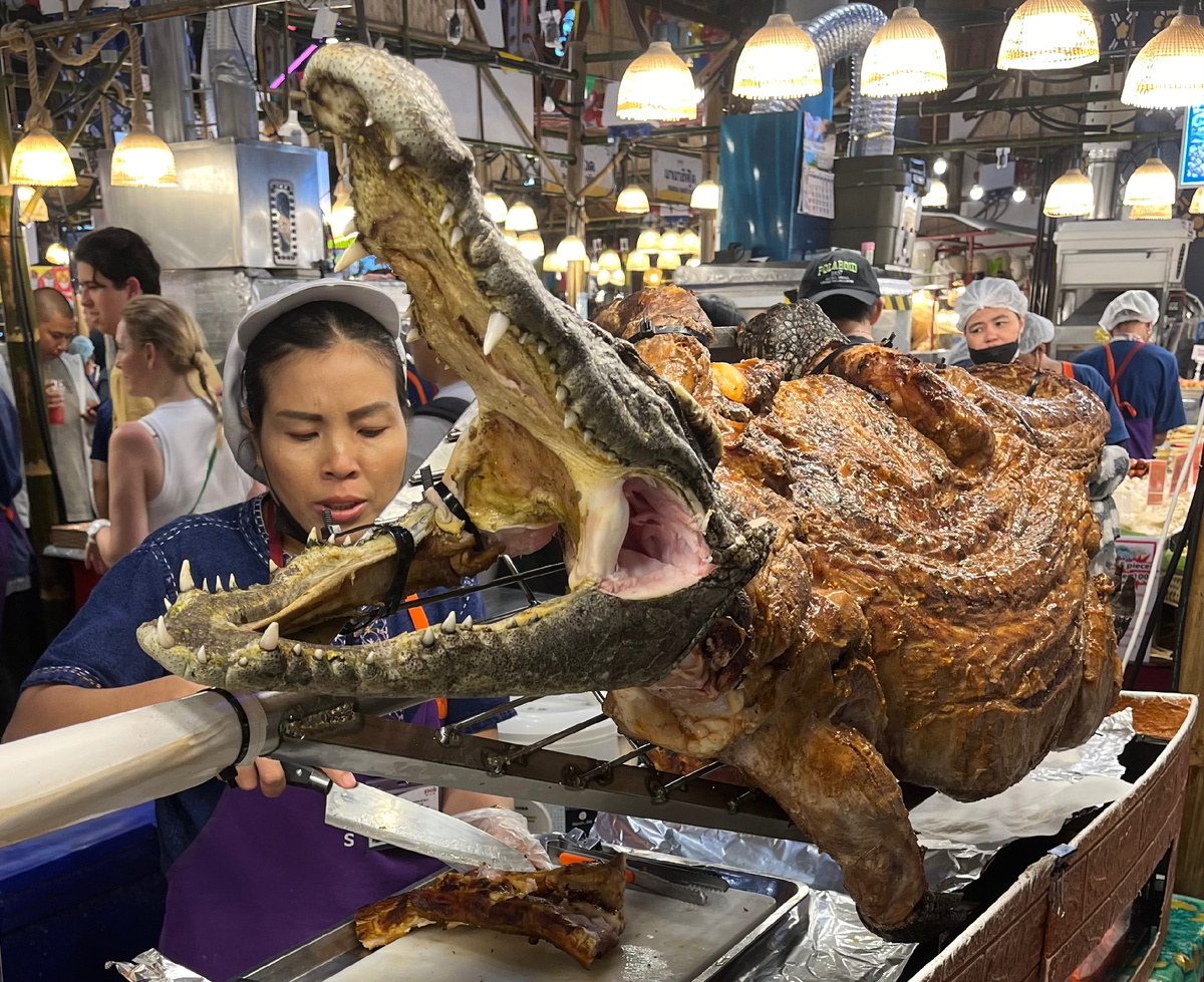 Продавцы, чтобы привлечь внимание, подвешивают целую тушу крокодила прямо над прилавком. В отличие от уличных рынков, здесь все выглядит чисто и ухоженно, насекомые не кружат над мясом, поэтому мы решили рискнуть.
