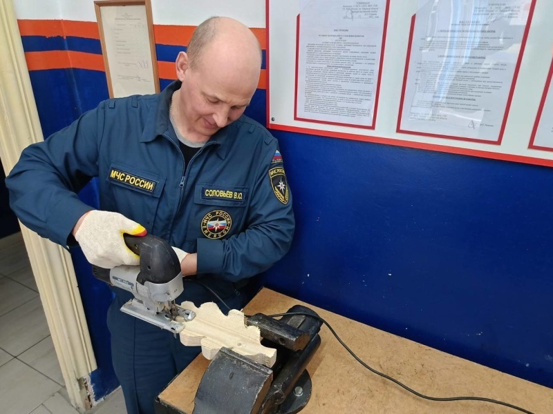 Если посетить 12-ю пожарно-спасательную часть города Ржев, то прямо у входа вас встретит нечто удивительное — причудливые фигуры из дерева, массивная резная лавочка и уютная беседка. Эти произведения искусства созданы руками одного из сотрудников части — командира отделения Виктора Соловьёва. Примерно десять лет назад Виктора увлекла идея попробовать себя в резьбе по дереву. Начав с простых кормушек и скворечников, он постепенно перешёл к созданию больших и сложных фигур. Специального образования у меня нет — всему научился самостоятельно, просматривая видеоуроки в интернете, а идеи черпаю исключительно из собственной фантазии – признается мастер. От работы хобби никак не отвлекает, занимается им в свободное время между сутками. Работа пожарным даёт большое количество идей. Например, изготовлено множество фигур огнеборцев и маленьких копий пожарных частей. Виктор создал множество деревянных изделий не только для части, но и для друзей, а также для детских садов родного города. Теперь д