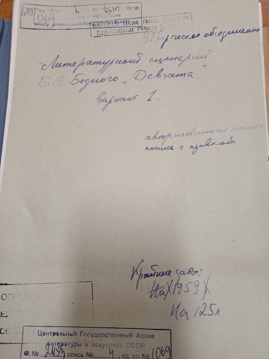 2. Переходим к оглавлениям литературного сценария Б.Бедного. Сначала документ – обложка сценария. Обратите внимание на год!