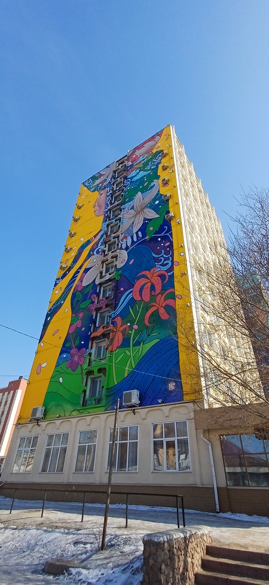 Прямо за аркой свернули налево - и вот он, красавец-отель "Бурятия", украшенный гигантским 30-метровым ярким муралом "Мелодия родной земли" местного художника Зоригто Доржиева,