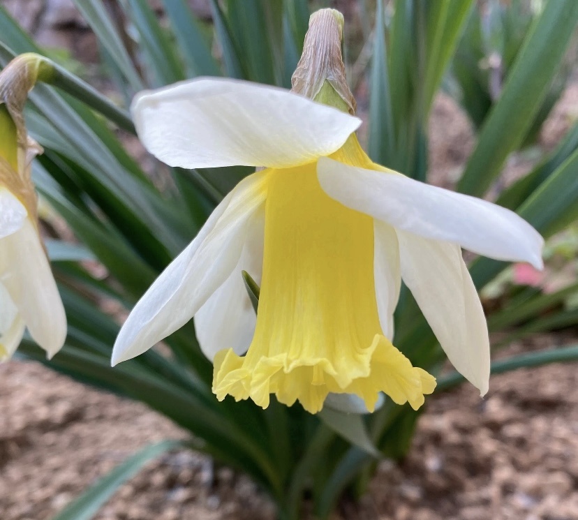17.03.25. Подбираем одновременно цветущие растения. А то нарцисс нарциссу рознь. На данный момент в саду цветёт только один ранний нарцисс. Расцветает с желтоватой серединкой , которая постепенно светлеет. Определила его как трубчатый нарцисс-хамелеон Mount Hood. Цветонос прочный, упругий, хорошо держит цветы даже в сильный ветер. Высокий нарцисс с крупными цветками Подходит любая почва, при условии что она плодородна и хорошо дренирована Лучше нейтральная. Подкормка комплексным минеральным удобрением несколько раз пойдет нарциссам на пользу. Если засуха, надо поливать, пока листья зелёные. 3-5 лет может расти на одном месте. Мои дольше растут на одном месте. Надо пересаживать. Продолжительность цветения 10-12 дней Лепестки открываются сливочно-бело-желтыми и постепенно светлеют до оттенка слоновой кости и дальше до чисто-белого. Остальные нарциссы только готовятся цвести, и ещё стоят в бутонах. Хотя некоторые бутоны выглядят не менее интересно чем цветы. Продолжают цвести прол