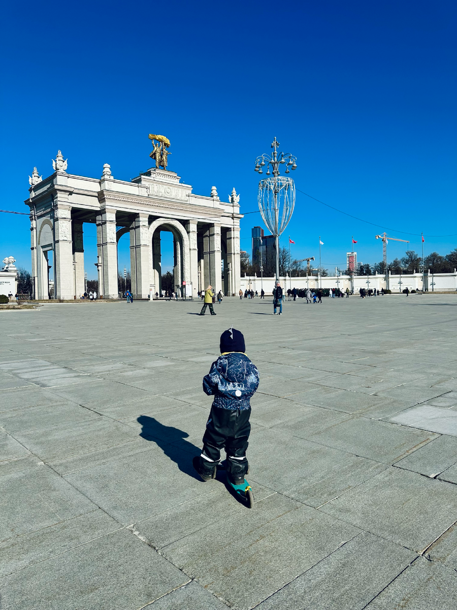 Недавно рассказывала тут о своём самом нелюбимом занятии с сыном — чистке зубов и носа. На самом деле, само занятие мне норм, но вот эти уговоры... просто ааа! Но ведь это не единственно нелюбимое занятие с сыном. Например, мне жутко скучно играть с ним в ролевые игры. Настолько, что аж иногда стыдно из-за этого. А сын обожает. Фразу «мам, давай играть в поезда» я слышу наверное раз триста за день. Поэтому в выходные всегда выманиваю ребёнка на прогулку. Это то, что я реально люблю. Например, в воскресенье мы с Тимом отправились в настоящее путешествие. Сложный маршрут спланировали заранее, чтобы не только погулять, но и сам путь был интересным. Приключение, короче! Взяли самокат и отправились в путь. Сначала на электричке, а потом на монорельсе. Тим уже один раз катался на монорельсе, но и в этот раз был восторг и куча вопросов. Пунктом нашего назначения была ВДНХ. Мы приехали к главному входу и пошли на поиски тех самых пончиков. Тим их ещё не пробовал. Давно я не была на ВДНХ, года