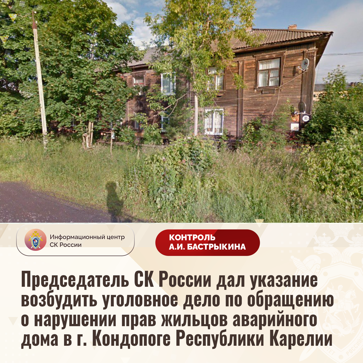 Председатель СК России дал указание возбудить уголовное дело по обращению о нарушении прав жильцов аварийного дома в г. Кондопоге Республики Карелии В приёмную Председателя СК России А.И. Бастрыкина «ВКонтакте» обратилась жительница Республики Карелии. Она сообщила, что в городе Кондопоге многоквартирный дом, 1950 года постройки, признанный аварийным в 2017 году, находится в непригодном для проживания состоянии: несущие конструкции, напольные и потолочные перекрытия разрушаются, в связи с нарушением целостности кровли жилые помещения затапливаются, инженерные системы изношены, печное отопление неисправно. Обращения в профильные структуры результатов не принесли, сроки расселения граждан постоянно переносятся. Председатель Следственного комитета Российской Федерации Александр Иванович Бастрыкин дал указание руководителю СУ СК России по Республике Карелии Евгению Николаевичу Швецу возбудить уголовное дело и представить доклад о ходе и результатах его расследования. Исполнение поручения п