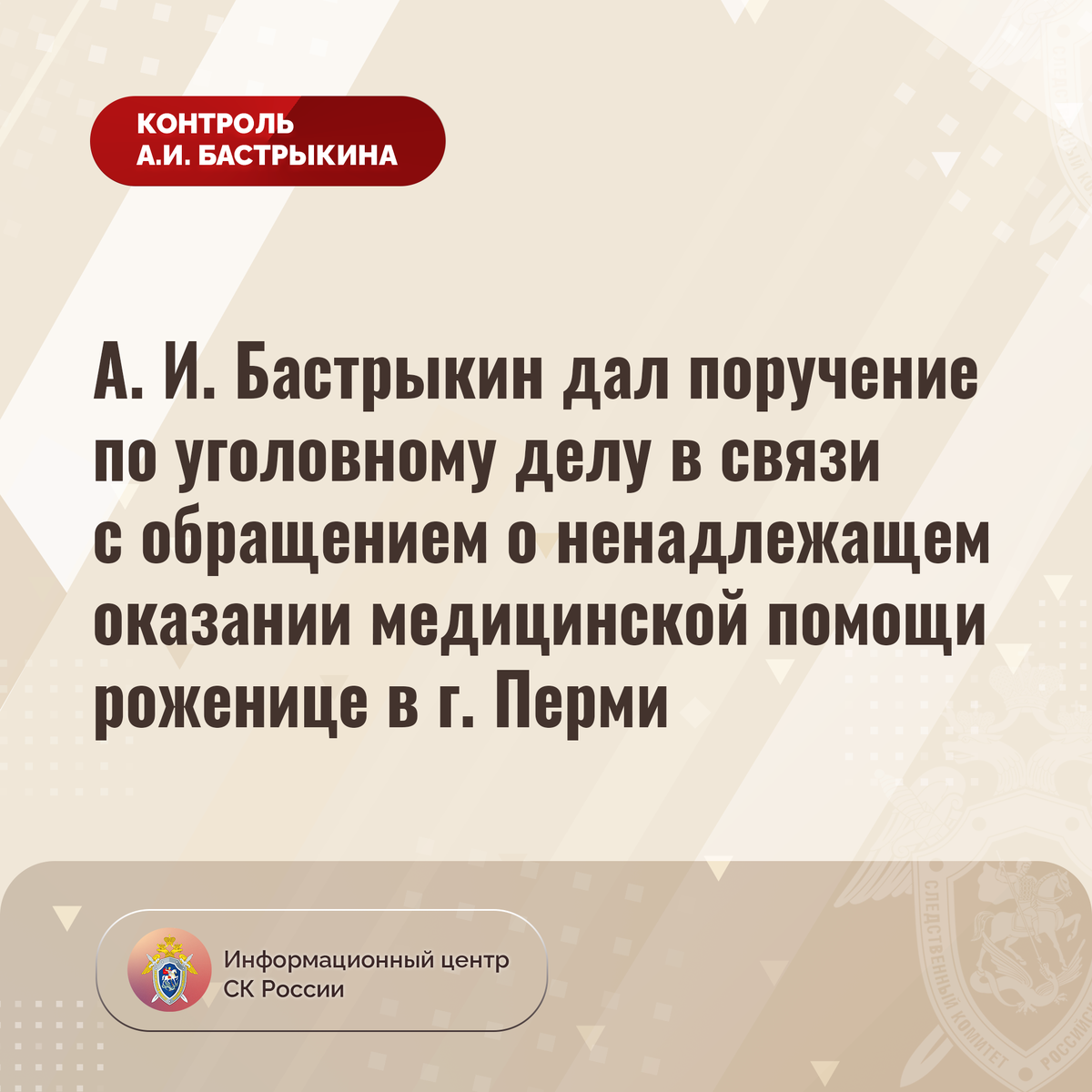 А. И. Бастрыкин дал поручение по уголовному делу в связи с обращением о ненадлежащем оказании медицинской помощи роженице в г. Перми В адрес Председателя СК России А.И. Бастрыкина через его приёмную «ВКонтакте» поступило обращение жительницы Пермского края, выразившей несогласие с ходом установления обстоятельств оказания ей медицинской помощи при родовспоможении в одной из больниц в городе Перми в 2023 году, вследствие чего новорожденный скончался. Заявительница указывает на затяжной характер расследования. В СУ СК России по Пермскому краю по данному факту расследуется уголовное дело. Председатель Следственного комитета Российской Федерации Александр Иванович Бастрыкин поручил руководителю СУ СК России по Пермскому краю Денису Валерьевичу Головкину принять меры к завершению расследования уголовного дела в кратчайшие сроки, о чем представить доклад. Исполнение поручения поставлено на контроль в центральном аппарате ведомства. #СледственныйКомитет #СКРоссии #СКР #ИЦСКР #ИнформационныйЦе