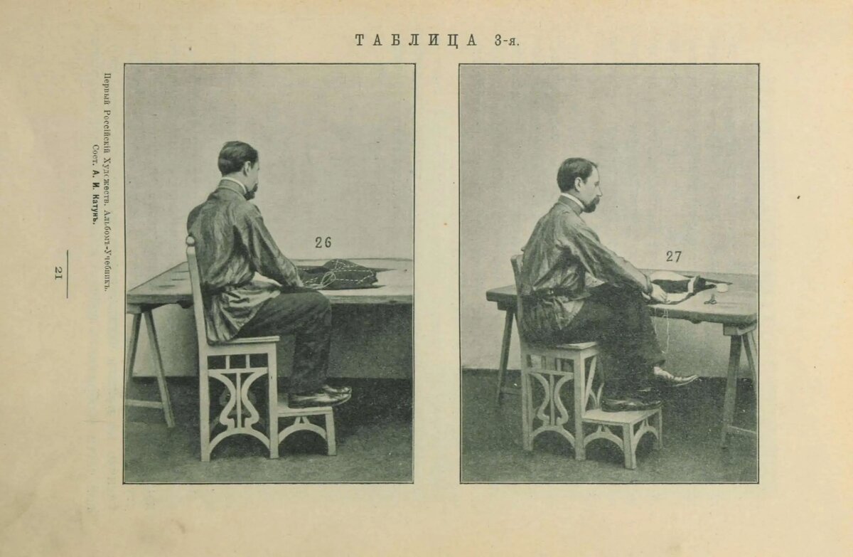 Вследствие издавна укоренившейся, не только у нас, но и за границей, привычки у портных сидеть на рабочем столе в согнутом положении, профессия эта отнесена к разряду ремёсел, крайне вредных для здоровья рабочих — постоянное расстройство пищеварительных органов, а нередко и другие серьёзные (так называемые профессиональные) заболевания; всё это является следствием неестественного согнутого положения, не говоря уже о том, что находиться во время работы в таком положении крайне утомительно. Я не разделяю установившегося среди портных мнения, что это неестественное положение при работе вызвано условиями нашего ремесла. Как и во многих других случаях, здесь приходится бороться с рутиной, в чём легко убедиться, стоит только вспомнить, что наши коллеги по профессии, портнихи, работают сидя на стульях, а не на верстаках. Поэтому простые стулья, на которых они работают, заменить специально приспособленными для портных.