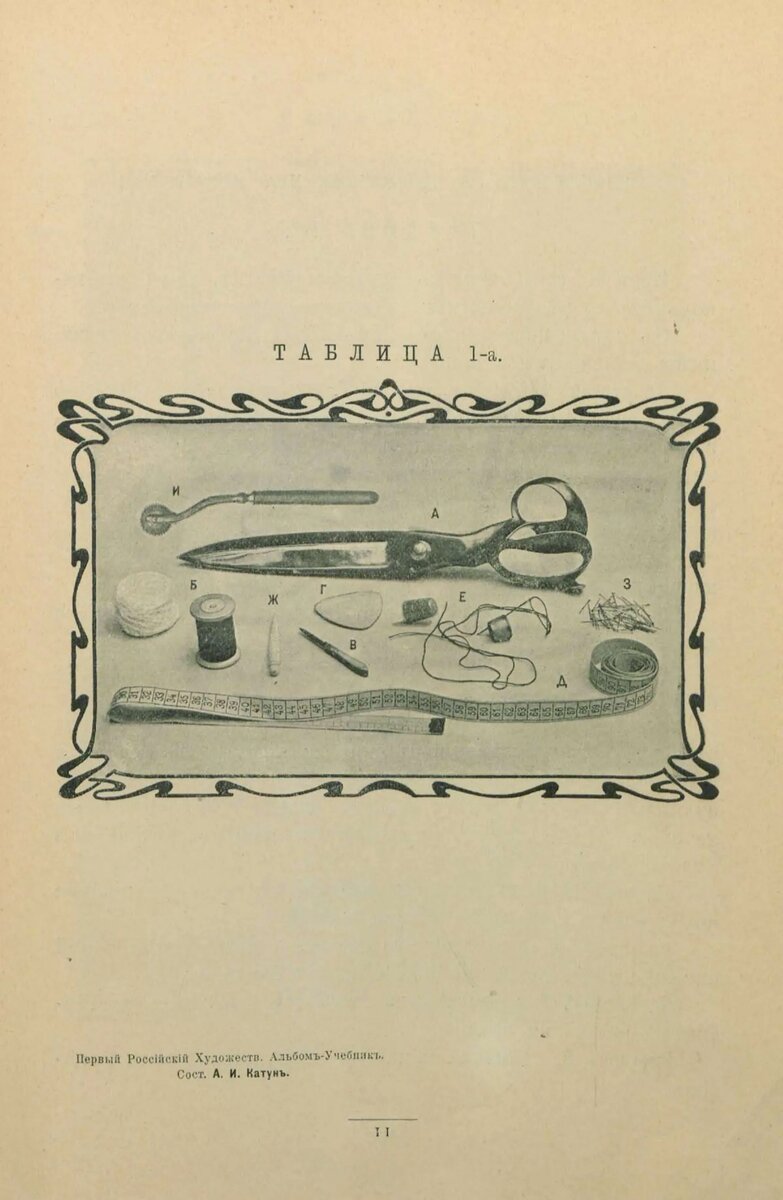Начиная знакомиться с Альбомом-Учебником "Портной", остановимся на таблице 1-а. Здесь мы видим предметы, которые имеются в каждой семье, и с которыми учащиеся уже частично знакомы: А — ножницы, Б — клубок наметки и катушка ниток, В — перочинный ножик, Г — плитка мела, Д — сантиметр, Е — игла с ниткой, на которую надет мужской наперсток, рядом с ним дамский наперсток, Ж — косточка для вытаскивания наметки и для выправления петель, З — булавки и И — резец для снятия выкроек. Когда нужно снять выкройку, кладут на стол лист бумаги, сверху скроенный предмет. Чтобы он не сбивался, его прикалывают к столу кнопками (маленькими железными гвоздиками). Затем по меловому контуру проводят резцом; на бумаге появляется линия, по которой вырезают выкройку. Если хочется избежать дырочек от резца на столе, можно подложить сукно, а поверх него — бумагу. Перед началом обучения ремеслу важно ознакомиться с предметами, необходимыми в мастерской. В портняжном деле обязательно нужны манекены для примерки