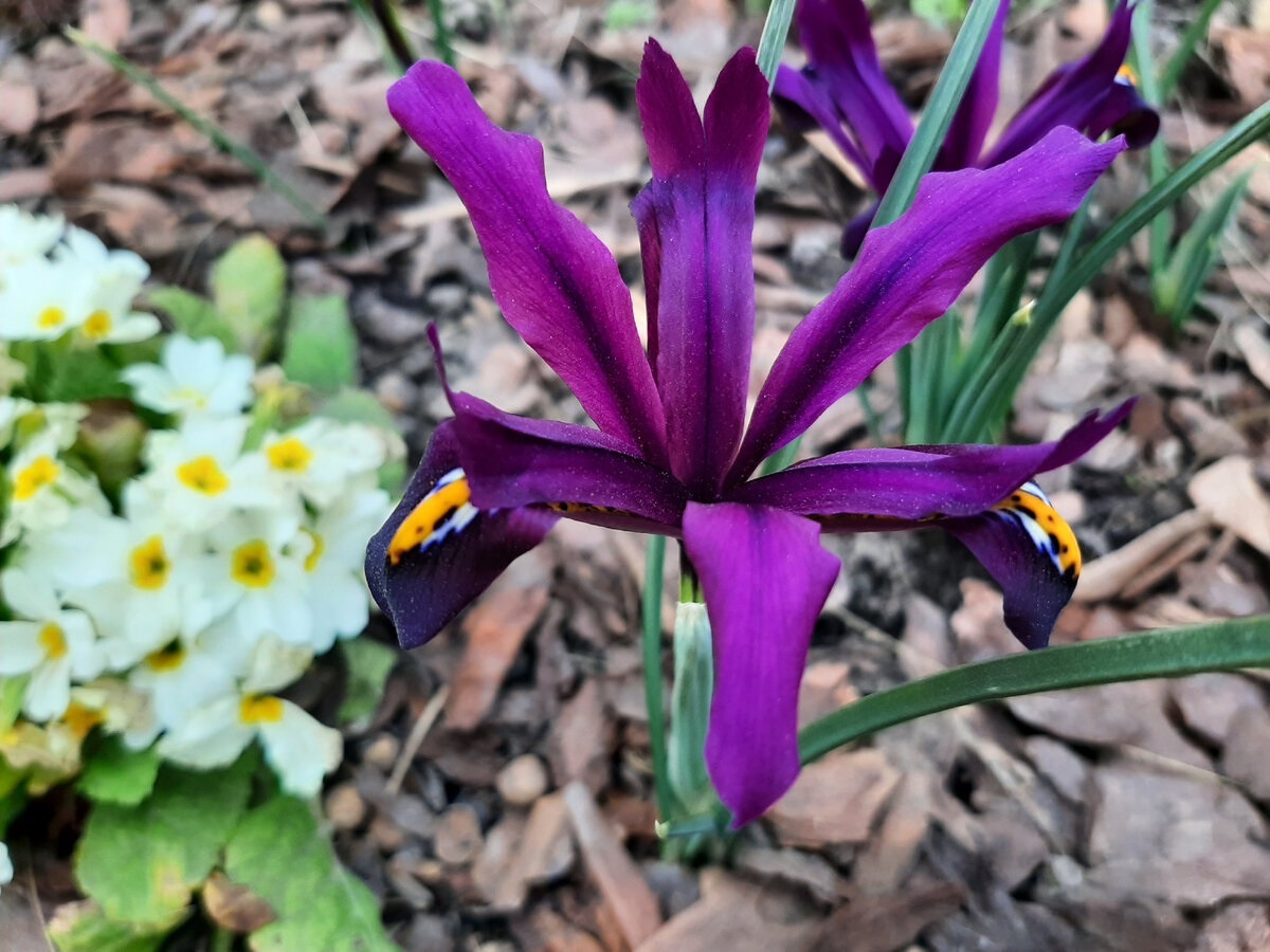 Сегодня я хочу Вам рассказать о двух сортах иридодиктумов, которые обладают тёмным цветом, эта особенность немного усложняет цветовое восприятие, но покажу, как пытаюсь справиться с этой проблемой. Дело ведь в том, что первоцветы выпускают сначала цветы, а уже потом листья, вокруг них серая, голая земля, радостно зеленеют в это время только сорняки, но они нам не компания. И вот распускается такой ирис глубоко фиолетового цвета на фоне сухих листьев, коры или грунта и его практически не видно. Сорт неизвестен, предположительно Purple Gem Один из этих тёмных иридодиктумов у меня уже давно, из нескольких луковиц разросся до двух приличных куртин. Приобретён был во времена, когда за радость и достижение считалось запомнить хотя бы просто название растения, о сорте и речь не велась. Может быть, у кого-то растёт сорт Purple Gem? Подскажите это у меня он? Сорт старый распространённый, но часто у продавцов на фотографиях под этим именем немного другие иридодиктумы, потому до сих пор безымянны