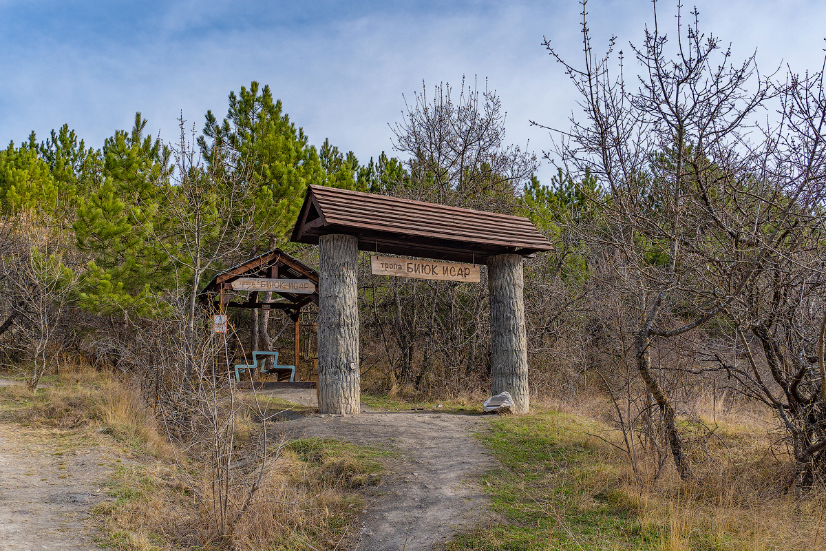 Поднявшись на очередной пригорок, мы вышли на ровный участок. Тут от нашей тропы было несколько ответвлений в сторону скал Биюк-Исар. Как мы поняли, одна из этих троп ведет на вершину горы, вторая в грот.