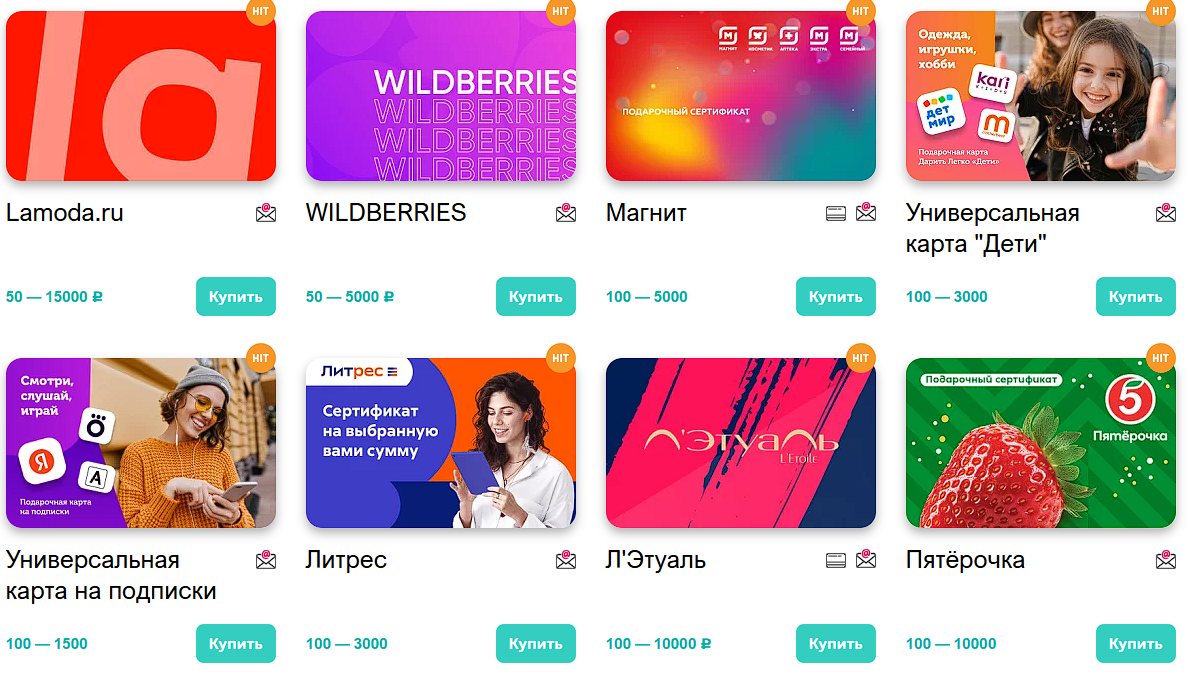 На данных площадках, можно покупать сертификаты в различные магазины и маркетплейсы. Номинал выбираете сами, обычно он идет от 300-500 р. Сертификатов огромное количество. Но стоит учесть, что на некоторые магазины будет небольшая наценка (при заказе это видно сразу). По большинству сертификатов можно выбрать будет ли это электронный сертификат или подарочная карта. Сертификат приходит на указанную почту в течении 10 минут, карту привезет курьер в указанные при оформлении сроки. Так же, перед заказом внимательно прочитайте правила. Некоторые сертификаты можно использовать только при покупке оффлайн (не действуют на заказ онлайн). Если покупка менее лимита сертификата, обычно остаток по нему сгорает. Если больше - можно доплатить любым способом. Сроки сертификатов в основном от года. Для чего эта возня? Для кешбэка, конечно. При выпадении удачной категории с хорошим процентом кешбэка по какой-либо карте, можно покупать сертификаты на те же продукты, технику, алкоголь и т.п. с хорошей в