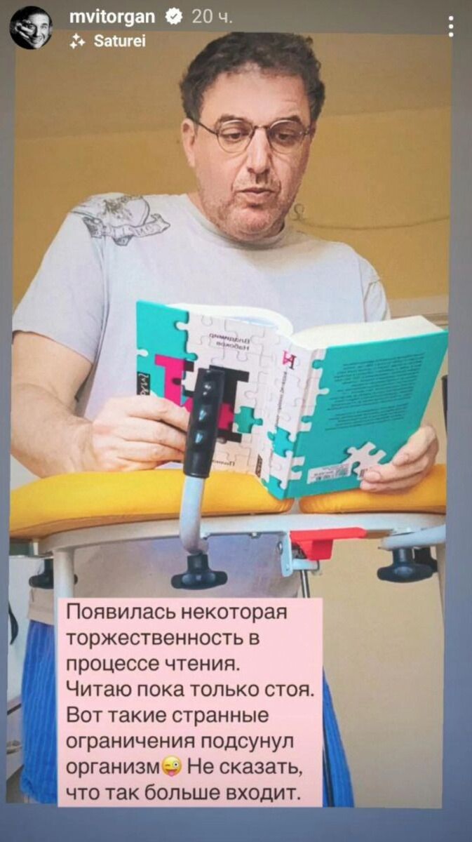 Несколько дней назад 52-летний Максим Виторган перенес операцию. Он не рассказал, какое именно было вмешательство и для чего, но вышел на связь с поклонниками из больничной палаты. Актер пожаловался, что после операции у него появились некоторые ограничения в образе жизни. Например, читать книгу он пока может только стоя. «Появилась некоторая торжественность в процессе чтения. Читаю пока только стоя. Вот такие странные ограничения подсунул организм. Не сказать, что так больше входит», — поделился Максим. Максим Виторган. Фото: соцсети / @mvitorgan Он опубликовал фото, на котором стоит на ходунках. Сейчас артист не может передвигаться самостоятельно, но не унывает. Виторган считает, что временные трудности не должны заставлять его грустить. «Я и мой индивидуальный транспорт. Спасибо всем за слова и дела поддержки! Мы будем жить теперь по-новому (оно же хорошо забытое старое)», — подытожил Виторган. Напомним, что в первые дни 2025 года бывший муж Ксении Собчакпредставил поклонникам новую