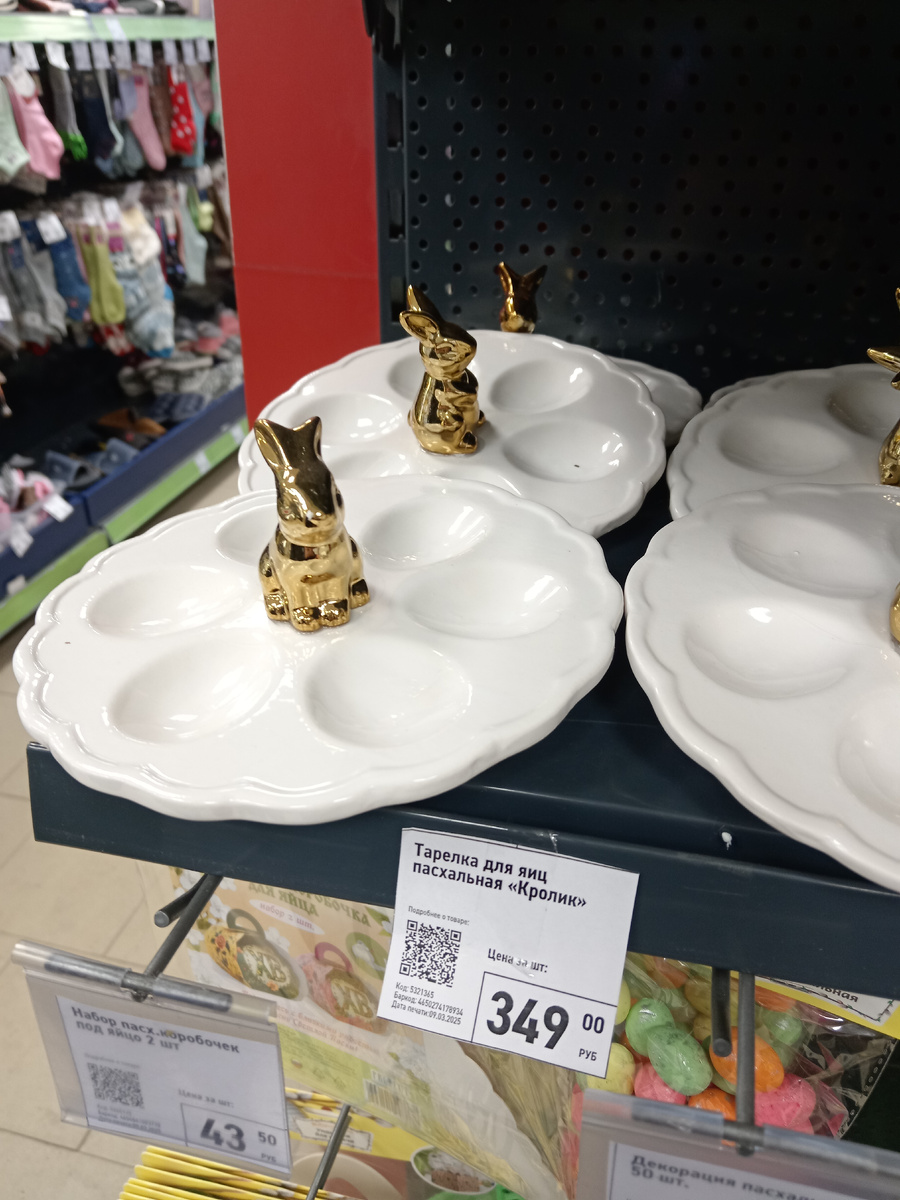 Добрый вечер всем! Сегодня мы с вами идём в магазин "Фикс Прайс" за товарами для Пасхи. Пасхальная тарелка для яиц «Кролик». Вмещает 6 яиц. Размер: 18х18х9 см. Состав: фарфор. Цена: 349 рублей. Керамическая фигурка «Кролик». Размер: 7х7х16 см. Состав: керамика. Цена: 149 рублей. Подставка в форме кролика, вмещает 7 яиц. Размер: 15х15х23,5 см. Состав: углеродистая сталь. Цена: 149 рублей. Тарелка «Кролик». Состав: керамика. Цена: 349 рублей. Пасхальный набор «Золотые узоры». В комплекте 4 пищевых красителя, лист с декоративными наклейками, лист с подставками для яиц. Цена: 33 рубля. Пасхальная декорация в мешочке. Размер: 19 см. Состав: полипропилен, пенополиэтилен, джут, полиэтилен, сталь, бамбук, полиэстер. Набор пасхальных солонок состоит из двух изделий в форме зверушек. Состав: керамика, ПВХ. Цена: 199 рублей. Фигурки декоративные «Птенцы». В наборе 6 фигурок. Размер упаковки: 6х7х8 см. Состав: полиэстер, полиэфирное волокно, полипропилен, полирезин. Игрушка «Светящийся цыплёнок»