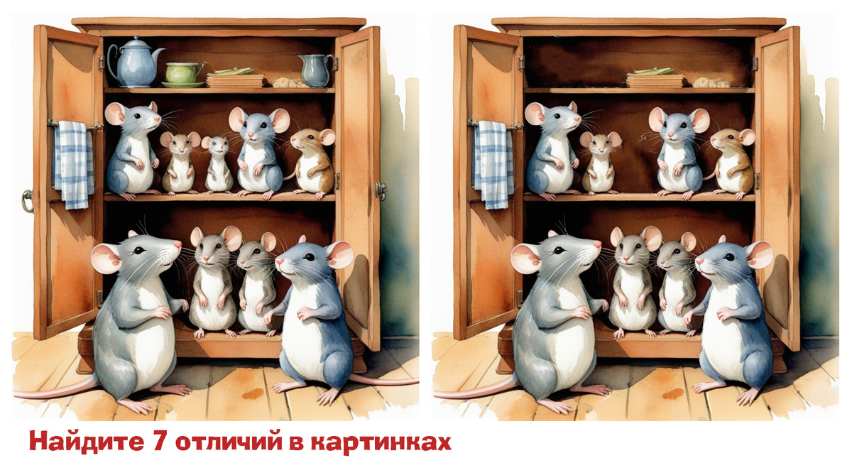 Как говорят кладовщики: "Где мыши прячутся, там и сюрпризы случаются." В уютном шкафчике жизнь идёт своим чередом. Чайник на полке, посуда аккуратно сложена, а среди припасов расположилась целая мышиная семья. Но что-то не так… То ли кто-то сменил позу, то ли угощение на полке вдруг изменилось? Найди 7 отличий и помоги мышатам сохранить порядок в своём доме. Горизонтальная картинка: Вертикальная для телефонов: Ты справилась ловко – глаз у тебя точный, как у самого опытного кладовщика. Угадай спрятанные фрагменты и пусть день будет лёгким, а дела – успешными. До встречи.