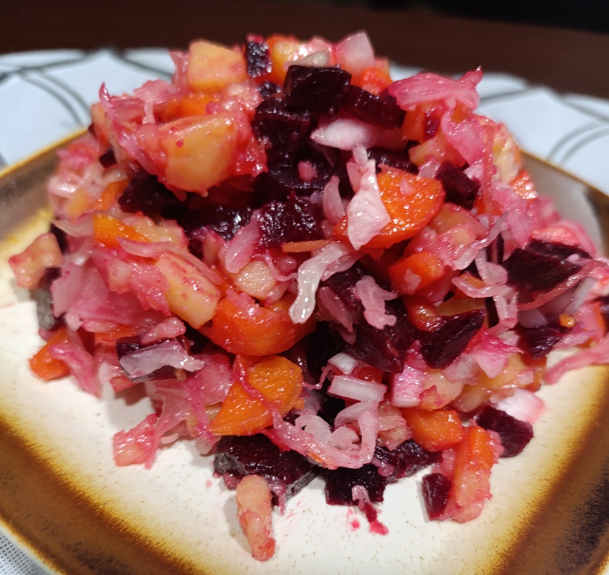 Каждый из нас хоть раз в жизни кушал этот салат. Особенно он незаменим в осенне-весенний период, так как является источником витамина С. Рецептов его приготовления также много как и рецептов приготовления борща. Да и вариантов заправки великое множество: рафинированное растительное масло, нерафинированное растительное масло, майонез, горчичная заправка. Я хочу предложить 5 способов приготовления этого салата. Винегрет классический Состав: картофель, свекла, морковь, соленые огурцы, лук и растительное масло. Картофеля, свеклы берут в равных количествах по весу, моркови и огурцов в половину меньше, а лука в три раза меньше. Например, 500 гр свеклы, 500 гр картофеля, 250 гр моркови, 250 гр огурцов и около 150 гр лука. Если огурцы сильно соленые, то можно взять меньше. Все овощи, кроме лука и огурцов, отвариваются (как быстро отварить овощи в микроволновке можно прочитать здесь), нарезаются приблизительно одинаковым кубиком и перемешиваются. Лук нарезается мелко добавляется к овощам, огур