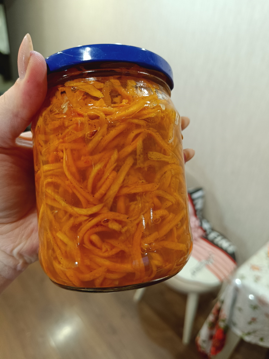 Сегодня разложила по баночками морковь по-корейски. Готовила ее вчера, ночь стояла, мариновалась. Готовлю постоянно по одному рецепту, который очень полюбился у нас в семье. Рецепт простой, но очень вкусная морковь по-корейски получается. За раз делаю много, уходит такая морковочка у нас очень быстро. - 2 кг моркови (вес уже натертой моркови); - 0.5 л яблочного уксуса; - 500 гр сахара; - 1 ст.ложка соли; - 0.5 ст.ложки молотого черного перца; - 7-8 средних зубчиков чеснока; - растительное масло. Морковь почистить и натереть на тёрке для моркови по-корейски. Самая моя нелюбимая часть этого рецепта, так как постоянно режу пальцы об эту тёрку. Мечтаю найти какой-нибудь кухонный гаджет, который может автоматически натерать так морковь. Но пока мои поиски не увенчались успехом 😔 поэтому пальцы продолжают страдать. Итак, морковь натерли, сложили в нужную нам емкость. Я делаю в тазике, так удобнее. В банки сразу раскладывать нет смысла, так как морковь усядет. К моркови я сразу добавляю