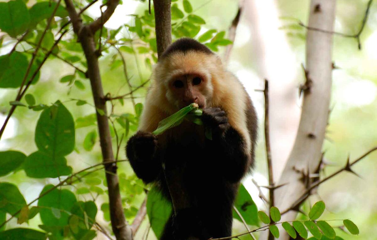 Капуцины питаются в основном фруктами, они составляют более половины рациона этих приматов. При этом в рацион капуцинов входят насекомые и растительная пища. Капуцины питаются цветками, побегами растений, молодыми листьями и ягодами. А также корешками, почками, корой, семенами и орехами. Из насекомых примат отдает предпочтение личинкам гусениц, жуков, и муравьев. Капуцин питается также мелкими птицами, лягушками и ящерицами. На листьях деревьев и под корой животные выискивают насекомых и рептилий. Частенько обезьянки наведываются и в птичьи гнезда, воруют яйца или птенцов. Так как капуцины очень смышленые обезьяны, прежде чем слопать лягушку, они могут, предварительно постучать ею об дерево, чтобы очистить от слизи. Любознательные обезьянки пробуют все новое на вкус и охотно делятся с другими. Эти умные приматы стучат камнем по ореху, чтобы достать вкусное ядро. Капуцины взрослеют относительно медленно. Самцы становятся репродуктивными только к десяти годам. Самки дают потомство только